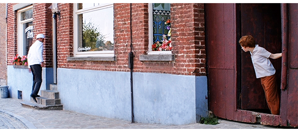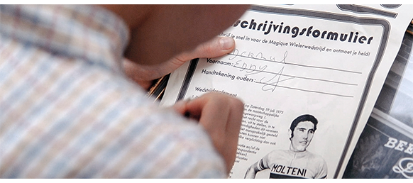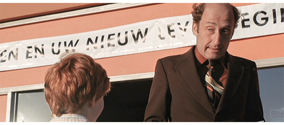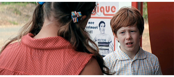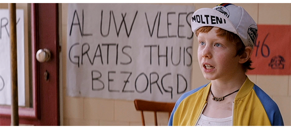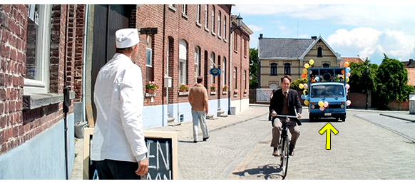 スーパーは、まだ開店準備中。入口には、「あなたの新しい生活が始まるまで あと4日!」と貼り紙がしてある。フレディが、店の左のショーウィンドウに飾ってあったモルテニのウェアを着たマネキンと、エディ・メルクスのポスターを見ていると(優勝カップも置いてある)、店長の娘が声を掛ける。彼女は、フランス語圏のベルギー人なので、フラマン語がうまく話せない。「えーと、運転手… 競技会」と言い、横にいた父に、フランス語で、「パパ、フラマン語でサイクリストのこと何て言うの?」と訊き、“wielrijder” だと教えてもらう。しかし、その単語を使ってもフレディには通じない。そこで、「エディ・メルクスのようなサイクリスト」と言い、“coureur(自転車競技者)” という単語(フランス語でも同じ意味)を訊き出す。「なんだ、フランス語と同じね。参加する?」。フレディの横の立て看板には、エディ・メルクスの写真とともに、「参加してヒーローに会おう!」と書かれている。「大会に? ううん。僕、1人で外出できないんだ」(1枚目の写真)。「優勝したら、ルーベ〔ベルギー国境に近いフランスの町/ロケ地の西南西約45キロ〕まで行って、エディ・メルクスに会える」。「ホント?」。「本当よ」。そう言うと、彼女は、1枚の紙を渡し、フレディの名前と、両親のどちらかの署名をもらうよう説明し、さらに、登録の最終は、今日の12時なので、あと1時間しかないと言う。フレディは走って家に戻り、店の壁に飾ってある父の署名入り写真の額をこっそり外すと、すぐ横の冷凍庫に入り、名前の欄に、氏は本当の「Dermul」、名は「Freddy」ではなく「Eddy」と書き込み、父の署名欄には、額のサインを真似て 書き入れる(2枚目の写真)。その時、店に 「攻撃的フラマン」と名乗るグループが入って来て、目的は、新しいスーパーマーケットに対するレジスタンス、要望は、息子の1人のグループへの参加だと言うが、危機感のない父から追い払われる。そして、冷凍庫を覗くとフレディがいたのでびっくりして部屋に戻るよう命じる(3枚目の写真)。