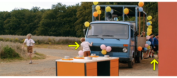 トラックがスーパーの前まで戻って来た時、ちょうど攻撃的フラマン隊がやって来る。そこで、トラックを下りたフレディは、トラックの運転席の側に隠れ、顔をあわせないようにする(1枚目の写真、左の矢印はフレディ、右の矢印は攻撃的フラマン隊の一部)。このすぐあと、攻撃的フラマン隊と参加したばかりのブリークは、掲示板に貼り付けてあるレース参加者の写真を見る。兄のブリークが注意を惹かれたのは、顔を隠した少年の写真(2枚目の写真、矢印)。全体の感じが弟のフレディにそっくりだったから。その日の夕食の話題は、結婚25周年のパーティで何を出すか。父は多めに言い、母は多過ぎると反対する。そこに、ブリークが、支給された隊の制服を持って帰ってくる。そして、隣に座っているフレディに、「お前、マジックのレースに出るエディか?」と詰問する。「レースって?」。「出るのか?」。「何に?」。「レースだ!」。「ううん!」。その会話は、母が、「ブリーク!」と叱って止めさせる。翌日、フレディはスーパーまで走って行き、掲示板から自分の写真を剥ぎ取る。マリーが、「なぜ、写真取ったの?」と訊くと、「出られないから」と言い、そのせいか、急にお腹が痛くなる(3枚目の写真)。今にも漏らしそうなので、フレディは家まで走って戻るが、その次のシーンでは、映画の冒頭と同じようにバスタブに入っているので、途中で漏らしたのであろう。