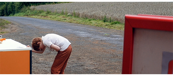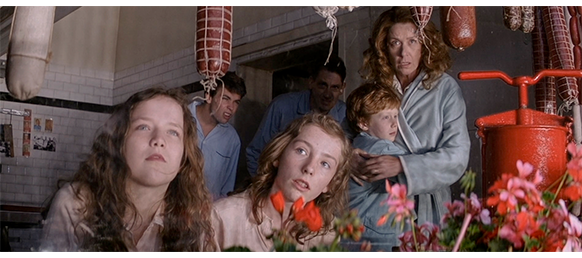 その2軒目、父も知らなかった家のドアの前には、見覚えのある自転車が停めてある。呼び鈴を鳴らすと、出て来たのはマリー。「今日は、サイクリスト」。フレディは、「今日は、マリー。ここに住んでるの?」と言って、品物を渡し、「6.2フランです」と支払いを求める。マリーは、フレディの帽子にもTシャツにもモルテニがいっぱいあるのを指摘し、包みを開けて(1枚目の写真)、中身を少し口に入れる。そして、「マジックのよりおいしいわ」と言ってくれる。そして、品物を置きに行き、お金を持って来ると、「一緒に行ってもいい?」と訊く。「追いつけないよ」。麦畑の中を走るフレディに、マリーは 「もっとゆっくり!」と叫ぶ。フレディは、自転車から降りて麦畑に横になる。その横にマリーが並んで座ったので、フレディは体を起こす。マリーは、鼓動の激しい胸を押さえて 「私の心臓」と言うと、フレディの手を取って胸に押し当て、「感じられる?」と訊く。何となく恥ずかしいので、フレディが手を放すと、マリーはもう一度手を取り 「ちゃんと感じて」と言う(2枚目の写真)。そして、「数日後、ルーベでエディ・メルクスに会いましょ」と笑顔で言う。「僕、行くの許されてないんだ」。「来るのよ。あなたのパパに言うわ」。「言っちゃダメだよ」。「言っちゃうわよ」。「ダメ」。「言うわ」。2人は自転車で家まで来ると、そこで手をパチンと合わせて別れる。それを窓から見ていた父は、息子にガールフレンドができたと思ってニコニコする。そして、フレディが売り上げ金を渡すと、フレディの服にいっぱい付いている黒いものを見て、「それ、何だ?」と訊く。そして、1つ取って 「草か?」と訊く。「転んだから」。「転んだ? 誰と?」。「マリーと」。「マリー? マリーって誰?」。「スーパーマーケットの」。それを聞いた父は態度を急変させ、「二度とそこには行くな」と言う。「パパが行かせた」。「何だと?」。「宅配に」(3枚目の写真)。「マリーと草むらで転がったのも、俺が言ったからか?」。「僕が転んだ」。「さぞや、痛かったろうな」。2人は かくして喧嘩別れ。父と、3人の女性だけの夕食。最初に一口食べた長女が、思わず吐き出し、「この肉、変な味がするわ」と指摘する。父が食べた方の肉は普通の味だったが、母も吐き出す。肉を調べに行った父が見たものは、以前見た時の10倍もいる蛆虫〔こんな物を、放置して食べさせた父は、肉屋として完全に失格だ〕。