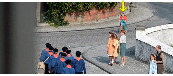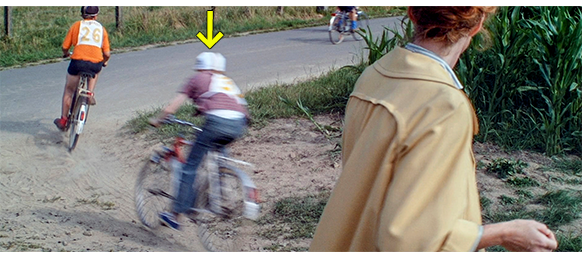 スタート間際。スタート地点に、攻撃的フラマン隊や、フレディの母を含めた個人商店の反対派がやってきて、気勢を上げる(1枚目の写真、矢印は姉と母、その左の隊の最後尾に兄)。お陰で、スタート地点の脇に設けられた仮設テントは、主催者や町長、それに警官隊と、反対派が混じり合って大混乱。フレディの父の肉屋の前では、父がレースを妨害しようと、解体した豚の半身を持ち出してきて、混乱が起きている。スタート地点では、店長がライフル銃を持って現れたので、反対派は逃げ惑う。店長は、「銃はレース用です」と言って、周りを落ち着かせる。マリーと一緒に会場まで間に合って到着したフレディは、始終顔を伏せて、気付かれないようにしている(2枚目の写真)。マリーがフレディに選手の番号(37番)を付けると、すぐに銃が鳴り、レースは混乱の中で開始される。フレディは、誰にも見つからずに、スタート地点を最後尾で通過。途中でどんどん順位を上げるが、トップで肉屋の前まで来た時、父の豚が巻き起こした騒動を止まって見てしまい、どんどん追い抜かれる。そこで、再スタートし、馬力をかけて力走。野道を走って舗装道路に出る所で、戻って来た母と2人の姉とすれ違う。その時、母に気付かれてしまう(3枚目の写真、矢印)。