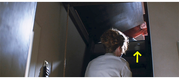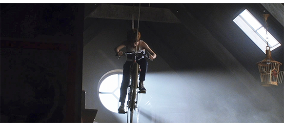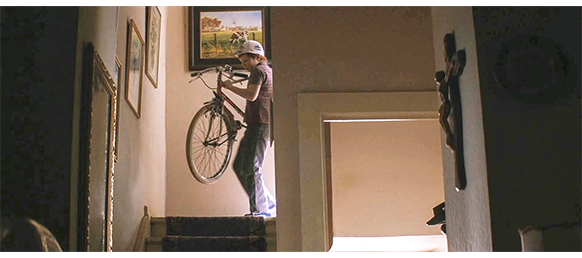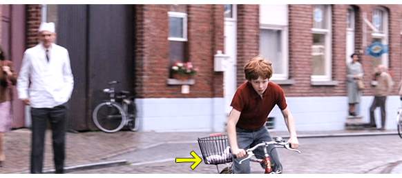 レースのスタート時間が迫ってくるが、母は、屋根裏への梯子を ミルクを持って登って来ると、「私たちは、スーパーマーケットに抗議に行くから、ここにいなさい」とフレディに命じる。父は、店の前で、タダで試食用の肉を通行人に食べさせている。母と2人の姉は、攻撃的フラマン隊と一緒に、スーパーに向かって歩いて行く。窓からそれを見ていたフレディは、マリーが自転車で呼びに来たのに気付くと(1枚目の写真、矢印)、急いで降りて行き、店から外に出ようとして父に捕まり、試食用の肉のトレイを渡されて、「すべて半額」と叫ぶよう命じられる。外に出てきたフレディに、マリーは、レース開始まで10分だと急かせる。フレディは、道の角で待っているよう頼むと、父には、腹痛のフリをし(2枚目の写真)、トイレに行かされると、そのまま部屋まで走って行き、自転車を持って階段の方から降りて来て(3枚目の写真)、屋根裏部屋の下の出口から自転車に乗って出て行くと、親切なマリーに合流する。