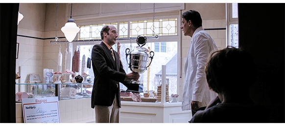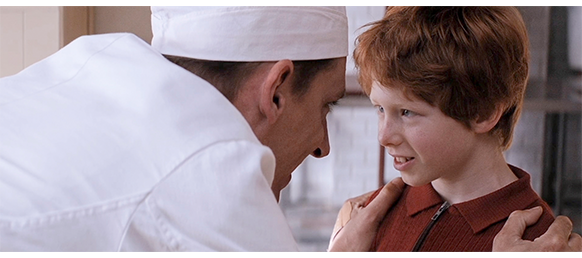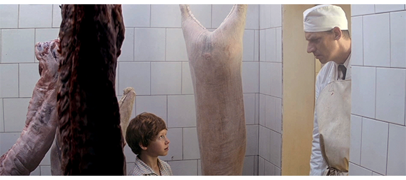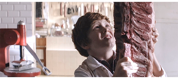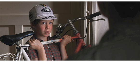 それからのフレディは、白衣を着て豚肉との格闘が続く(1枚目の写真)。マリエット伯母が来ても、連れて行ってもらえるのは、母と2人の姉だけ。2人だけで食事中に、店にスーパーの店長がやって来て、父が顔を出すと、「あなたの息子さんは、優勝カップを持って行くのを忘れました。ルーベへの招待状も一緒に持って来ました」と言う。父は 「出て行け」と、出口を指す。そんな失礼なことを言われても、店長は、「でも、あなたの息子さんはレースに勝ったのです。エディ・メルクスに会えるんですよ」と言いながら、優勝カップを手に持ち、「あなたの息子さんには才能があります。参加させて下さい」と言って、優勝カップを差し出す(2枚目の写真)。フレディは、「参加させてよ。エディ・メルクスに会わせてよ」と父に頼むが、自分の仕事を奪うスーパーマーケットを許せない父は、持っていた大型包丁を振るって 優勝カップのキャップを跳ね飛ばす。怖くなった店長は、優勝カップの下半分を床に置くと、逃げ出していく。父は、自分を睨んでいるフレディーを見ると、「何だ、その目付きは?」と文句を言う。屋根裏に行ったフレディーは、床に置いてあった物を蹴散らして、怒りを爆発させる。次のシーンでは、父に、無理矢理 肉の切り方を教えられている最中に、指を少し切ってしまい、思わず包丁を床に落とす。大事な包丁を粗末に扱ったことを叱る父に対し、フレディは、「血が出てる!」。「それがどうした?」。「こんな肉屋、大嫌いだ!」。「慣れるんだ。お前は、ずっとここにいるんだから」。「いるもんか!」。「サイクリストにでもなるつもりか?」。「大嫌いだ!!」(3枚目の写真)。「俺も、大嫌いだ! この裏切り者! 家族全員に恥をかかせやがって! この恥知らず! 肉屋になれることを喜ばんか!」。「伯母さんと一緒に、都会に住む!」。父は、フレディの頭を叩く。
