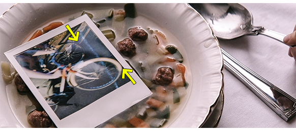 大急ぎで家に戻ったフレディは、自転車を持ち上げて階段を上がろうとして、母から声を掛けられる。「どこにいたの?」。「どこにも」。「どこにも?」。「パパを探してた」(1枚目の写真)。「自転車で? よく そんな嘘が付けるわね。私が あんたを見なかったと思うの?! 37番!」。「だけど、勝ったよ、ママ」。「そうでしょうよ!」。フレディは、がっかりして自転車を持って屋根裏へ。夕食のテーブルは、沈黙が支配している。そこに、辛そうな顔のフレディがやってきて座る。母が一瞬睨む。父は、厳しい顔のまま、フレディを見ようともしない。その時、制服のまま入って来た兄が、優勝時の判定写真を、フレディが食べている皿の中に叩き入れ(2枚目の写真、2つの矢印は僅差の勝利を示す)、「何のつもりだ」と言って、フレディを小突く。それを見た母は、「ブリーク!」と兄を制止する。「こいつ、レースに参加したんだ」。「知ってるわ。父さんも知ってるわ」。兄は渋々フレディと父の間の席に座る。フレディは、父に向かって、「僕、勝ったよ、パパ。エディ・メルクスに会いに行くんだ」と言うが、父は、「お前は、誰にも会いに行かん。店でブリークの代わりをやれ」(3枚目の写真)「週7日。昼も夜も。分かったか?!」と怒鳴ると、席を立つ。