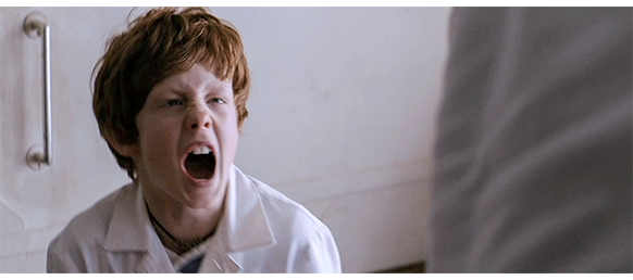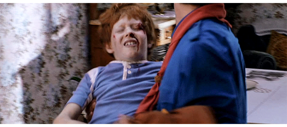 その途中で、不運なことに、攻撃的フラマン隊のチンピラどもと遭遇する。そして、後ろに回った隊員の一人が、フレディの “お漏らし” を指摘して(1枚目の写真)、全員が笑う。隊長は、兄のブリークに、「お前の家族は、いったい何なんだ? 協力者か? お漏らし屋か?」。ブルークは、その批判を打ち消そうと、フレディを押し倒す。すると、他の隊員が、レディの大事な自転車を投げて蹴飛ばす。怒ったフレディが、その隊員に飛びかかり、フレディは2人の隊員に髪をつかまれて殴られる。倒れたフレディを足で蹴った卑怯者を見て、遂にブリークも “自分が兄” であることに気付き、蹴った相手に飛び掛かる。8人の不良による、ブリークとフレディに対する一方的な攻撃が始まる(2枚目の写真)。映像はここで終わり、傷だらけのフレディが ブリークに抱かれて家に戻ってくる(3枚目の写真)。フレディが母に抱かれて連れ去られた後、ブリークは、「パパ、僕、攻撃を止められなかった」と告白し、頬を殴られる。母は フレディをバスタブに立たせ、顔に付いた血をきれいにする。
