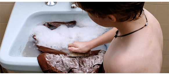 そこに、養豚業者が入って来て、フレディに 「やったな。素敵なレースだったぞ」と声をかけ、父が言った “恥” 云々を打ち消してくれたが、肝心の豚は持って来なかった。業者は 父を外に連れ出すと、今後は マジックだけに豚を納めることにしたので、父には売らないと言う。それでは、店をやっていけなくなるので、父は 「そんなことできないだろ。なんで? そんなに借金があったか? 買値を上げろとでも? スーパーは幾らで買ってくれる?」と必死になって 取り引きの継続を要望するが、業者は、「そういうことじゃない」(1枚目の写真、矢印は業者)「あんたも目を開けるんだ! 世の中は変わった。みんなも変わらないと」と言うと、父の必死の願いを無視して車を出してしまう。店に戻った父は、包丁を肉塊に何度も切り付けて怒りを爆発させる。そのうちに、手を切ってしまい、販売用の肉が切れなくなったのでフレディに切らせ、暇になったので店から外に出て行きスーパーの買い物袋を手にした常連客に 「裏切者! 協力(スーパーへの)者!」と怒鳴ったり、スーパーでもらった風船を持った少女の風船を割ったりする。そうした愚かな行為を見ていると、フレディは腹痛を起こす。しかし、助けてくれる母はいない。父に、「助けて」と頼んでも断られ(2枚目の写真)、フレディは、糞で汚れたズボンを自分で洗う(3枚目の写真)。その頃、店では 売れ残った肉の中から蛆虫が見つかり〔夏なのに、冷却されたショーケースの中に入っていなければ肉はすぐ傷む〕、父は、くず入れに捨てる。そこに母が帰って来て、フレディが 父が何もしてくれなかったので、自分でズボンを洗ったと言うと、夫のことを 「悪い人ね」と言い、伯母さんの家には洗濯機があるとも言う〔糞で汚れたズボンを洗濯機で洗う?〕。