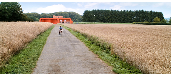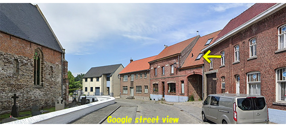 そして、映画は、地震の予兆を思わせる、コップに残ったミルクの振動から始まる。フレディの部屋のいろいろなものが、震度3程度の揺れで動き出し、怖くなったフレディは1階に入りていく。1階の肉屋の店に集まった家族は、そのはた迷惑な振動が、巨大なトラックが無理に舗石道路を通って行ったことに起因していることに気付き、トラックを睨みつける(1枚目の写真)。トラックの横には、「Magique」の大きな文字が。フランス語のマジックだが、この場合は、「魔法の」ではなく、「驚異の」という意味の店名。もれを見た父は、「スーパーマーケットだな」と言う〔「Open Edition Journals」によれば、食品と非食品を販売する面積2500㎡以上のサセフサービス店舗であるハイパーマーケットは、ヨーロッパでは1963年にフランスから始まったというのが通説。しかし、実際には、1961年にベルギーにオープンしたスーパーバザールの3店舗が発祥だと書かれている。映画では、フランスのマジックというチェーン店が、フレディの住む田舎町にもやってきたことで町が大きく変わる〕。それを聞いたフレディは、初めて聞いた言葉なので、「スーパーマーケット?」と訊き返す。「ああ、奴らは、1つ屋根の下で、何でも売るんだ。肉、魚、野菜、靴。すべてを1つの店で」。姉が 「競走用自転車も売るそうよ」と言うと、父は 「誰も、そんなトコで買いたがらん」と否定するが、フレディは 「僕、おっきな店 見てみたいな。チラとだっていい。何か面白そう」と逆の意見。それを聞いた父は、「とんだこと言う奴は、部屋に戻れ」と怒る。母にベッドまで連れて来られたフレディは、「スーパーマーケットは、どうしてそんなに悪いものなの?」と訊く(2枚目の写真)。母は、それには答えず、すぐに横にならせ、さっさと出て行く。この時、母は階段を上がって行くので、この屋根裏部屋には、2通りの入口があることになる。1階から梯子で登るか、隣接する建物の3階にある屋根裏から降りてくるかの2通りだ。このロケ地はブリュッセルの都心から約40キロ西にあるローゼベーケ(Rozebeke)という小さな町。グーグル・ストリートビューの写真を3枚目の示す(矢印がフレディの部屋の窓)。このあと、フレディは、この窓から出て、斜めになった屋根を登り反対側を見る。その時、登り切った時の、顔を映した映像の背後に教会が写っているが(4枚目の写真)、この教会は、3枚目の写真の左側にあるカトリック教会(壁の石や窓の形も同じ)。だから、4枚目の映像は、本当に、屋根の上まで登って撮影されたものだ。フレディは、屋根の上から反対側の野原の方を見ると、遠くの方にス-パーマーケットの建物が見える(5枚目の写真)。