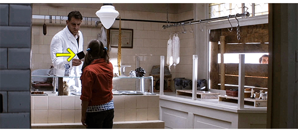 フレディは全速でスーパーまで走るが、受付けにいた店長に、「遅すぎた」と言われてしまう。「遅すぎ?」。「受付けはもう閉まった」。「だけど、僕、エディ・メルクス級だよ」。「エディ・メルクスはいつも1番に来るが、君は5分遅刻だ」。そこに、最初に勧誘した店長の娘が現われ、父親に、「まだ、5分あるわ。例外を認めたっていいでしょ」と、フレディを援護する。娘に甘い父親は 悲しそうに去って行くフレディを呼び寄せ、「娘の時計では12時5分前だそうだ。君はラッキーだな」と言い、「本当に、エディ・メルクスくらい上手いのか?」と訊く(1枚目の写真)。「はい、ホントです」(2枚目の写真)「勝って、彼に会います」。「勝ったら、ルーベに行ける」。フレディは、最初に娘から聞いたことを覚えてないらしく、「ルーベ?」と驚く。「ここに、来るんじゃないの?」。「エディ・メルクスが、こんな所までか? まさか。勝者は、彼に会いにルーベまで行くんだ。彼がメダルを渡し、一緒に写真に入ってくれる」。そこに、インスタントカメラを持った娘が来て、「フロマージュ〔チーズ〕」と言って顔写真を撮ろうとしたので、フレディは、慌てて両手を出して顔を隠す(3枚目の写真、矢印はカメラ)〔誰かにバレたら、レースに参加できなくなる〕。