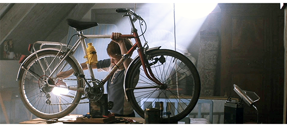 父は、そのあと屋根裏部屋に行き、フレディに、マリーが持って来た写真を渡す。それを見ながらベッドに座ったフレディの横に、父も座る。そして、新しくできるエディ・メルクス・チームに入らないかと尋ねる。「それ何?」。「パパは、スーパーで働くことになった。お前みたいに才能のある少年たちからなる新しいチームへの入団テストのリストに、スーパーのマジック経由で名前を入れることができる。エディ・メルクスがチームを後援してくれる」。「でも、僕、あれがあるから… 無理だよ」。「誰だって、何らかの問題を抱えてる。怖いからといって、一生、この部屋で過ごすことなんかできないぞ」。「僕、肉屋になるよ」。「お前なら、一流のサイクリストになれるぞ」(1枚目の写真)。父が出ていったあとで、マリーが持って来た写真を見る。そこには、エディ・メルクスが、マリーと一緒に写っている。フレディは、その横に、自分が写っている姿を空想する。そして、急にやる気になったフレディは、愚連隊に壊された自転車を元通りに修理する(2枚目の写真)。そして、「EDDY」のネックレスを 「FREDDY」に戻して(3枚目の写真)、首に掛け直す。