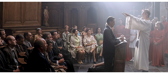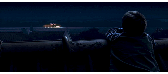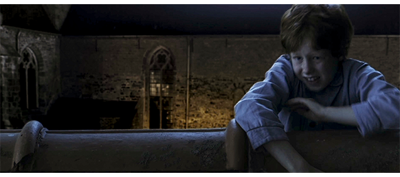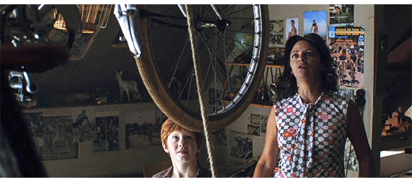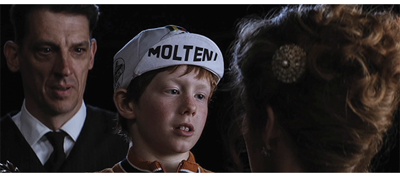 そして、家族5人が店の外に出る。店の前では、もう行進が始まっている(1枚目の写真)。行進に加わる予定だった兄は、父に誘われてメルクスの応援に行ってしまい、母と2人の娘だけが行進に加わり、歩いては立ち止るをくり返しながら ゆっくりと進んで行く。フレディは真っ暗な室内に差し込む僅かな太陽の光の元で、黒い布に、白い絵の具で「MOLTENI」と書いている〔有名なイタリアの自転車ウェアは、胸の部分に黒いモルテニの文字が入っている〕。その頃、母達は、歌いながら教会の中に入って行く。そして、いよいよレースがスタート。フレディの屋根裏部屋には、天井の梁から自転車がロープで吊ってあり、そこにフレディが乗り、全力で漕ぐ(2枚目の写真)。パブでは、父と兄を含む大勢の男達が、TVのメルクスに声援を送る(3枚目の写真)。そして、タイトル『Allez, Eddy!』が表示される〔この段階では、「Eddy」はエディ・メルクスしかいないので、メルクスを応援しているのかと誤解してしまう〕。