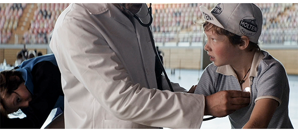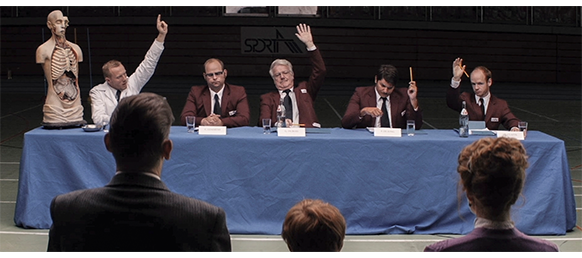 そして翌日、同じ会場に、父だけでなく母も現れる。そして、昨日の医師が説明を始めるが、昨日と違い、なぜかフランス語。そこで、委員長が3人に分かるように、フラマン語で通訳する。「腸に障害物(or閉塞)〔obstructie〕があります」(1枚目の写真)「腸が耐えきれなくなると、腸はドンと押し出します」。そして、「その障害物(or閉塞)は除去できますか?」と医師に質問する。医師の返事の通訳。「浣腸〔spoelingen〕で除去〔verwijderd〕できます。それで、腸は正常に機能します」〔非常に曖昧な表現なので理解困難。フラマン語の映画なので、上の台詞では要所のフラマン語を提示した(曖昧さが良く分かる)。障害物(or閉塞)とは何なのか? 浣腸で除去できるような簡単なものなのか? しかし、子供の時からずっと続いているということは、定期的に浣腸が必要ということなのか?〕。委員会はもめるが、委員長が採決を促し、5人のうち4人が賛成し(2枚目の写真)、チームへの参加が認められる。委員長は、「うまくいかない場合、フレディが辛い状況に行き着くかもしれないことを覚悟されておられるなら」と、両親に了解を求める。フレディは、母に 「お願い、ママ」と頼み、母は、息子と父親の両方の顔を何度も見た上で、正面を向いて 「是非とも〔Natuurlijk〕」と笑顔で了承する。委員長は 「これで、フレディは、正式に我々のチームのメンバーになりました」と宣言する(3枚目の写真)。「9月1日に待っています」。