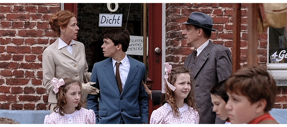 1。映画は、フレディが天地創造を叙述するところから始まる。「はじめに神は天と地とを創造された。動物と植物も」(最初の文章は、『創世記』の1.1。その先、急に、1.24と1.9の動物と植物に言及。「5日間で」(1.23、表現が違う)。ここからは、フレディの創作。「神が創造されたものは、すべて完璧だった。でも、ママは、6日目に神は間違い犯されたと言ってる。人を創造されたからだ」〔『創世記』1.27の記述は、単に、「神は自分のかたちに人を創造された…」だけ〕。ここで、場面は少し過去の現実に戻り、トウモロコシ畑の中でフレディは他の少年に追いかけられている。「皆(みんな)、見てたぞ。お漏らしパンツ!」。「うんち野郎!」。「臭うぞ!」。「そして、神は自らが創造した欠陥のある人々を助けるため、医者を創造された。その医者は、僕の頭とお尻の間に配線がないと言った」(1枚目の写真)「2つが結ばれていないから、僕はパンツを汚し続けるんだ〔無神経節症による便失禁〕。でも、神は医者に言うのを忘れてしまった… どうやったら欠陥を正常に戻せるかを。だから、僕は、天から処方箋が送られてくるのを待つしかない。それまでは、僕一人で出かけないのがベスト。なぜかって、ロクなことが起きないから」。そして、バスタブに入っているフレディに映像が変わると、第62回ツール・ド・フランス(1975年6月26日~7月20日)の出発点 ベルギー南部フランス語圏のシャルルロワから、スタート間近の様子を中継していいるラジオの音声に変わる。そこでの唯一の話題は、ベルギー中部フラマン語圏出身のロードレース選手エディ・メルクス(Eddy Merckx)〔1974年までに5回優勝〕が、今回、6回目の優勝をベルギーにもたらすかがどうかだ。次は、フレディがバスタブから出てパンツを3枚履き、その上から、ズボンを履くシーン(2枚目の写真、矢印は3枚のパンツ)〔失禁時の漏れ防止だが、いつも3枚では足りない。テープで留めるだけの大人用の紙おむつが開発されるのは1983年、赤ちゃん用の紙おむつでは小さ過ぎる〕。一家6人のうち、母、兄、2人の姉妹は、キリスト教の「ドゥ・プロセッシ(De processie)」というベルギーで盛んに行われている “行列して町をゆっくりと歩き、最後は教会に行く行事” に参加し、父は、パブでエディ・メルクスのTV応援に。フレディは、家から出ると失禁の可能性があるので、屋根裏部屋に閉じ込もり、母がミルクを階段の最上まで置きに行く(3枚目の写真、矢印はコップ)。