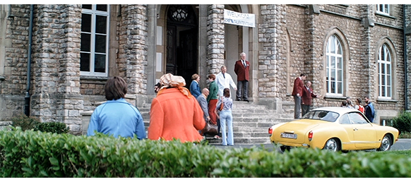 そして、9月1日、マリエット伯母が迎えに来る。父にはスーパーで仕事があるので、家の前でお別れ(1枚目の写真)。フレディは、後部座席から後ろを向いて、見送る父と兄と2人の姉に手を振る〔なぜ、マリーが来ないのだろう?〕。車は、寄宿学校の前に到着(2枚目の写真)。一緒に付いて来た母は、建物の玄関の前で最後の別れの抱擁をする(3枚目の写真)。最後の言葉は 「あなたが誇らしいわ」。