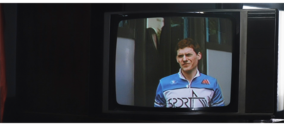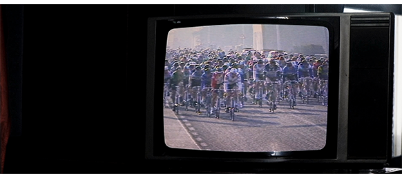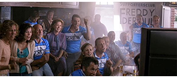 そして、映画は、10年半後の第70回フランダース・ツアー〔1986年4月6日、ベルギーフラマン語圏のシント=ニクラース~メールベーケ間275キロ〕。父だけでなく母も加わったパブでの集団観戦では、TVでエディ・メルクス・チームの新人フレディ・デルミュールが紹介される(1枚目の写真)。アナウンサー:「Langeworp〔架空の地名〕出身の、この才能ある若者が大きな大会に参加するのは、これが初めてです」。そして、選手たちは一斉にスタートする。バブで応援する住民たちは、「行け、フレディ〔Allez, Freddy〕!」と言って応援する。
