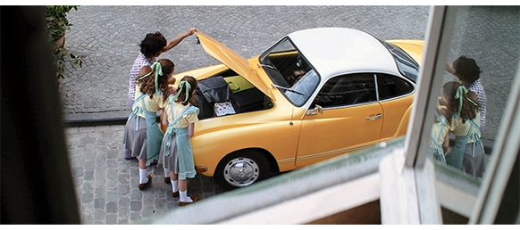 翌朝、父の姉のマリエット伯母が、フォルクスワーゲン・カルマンギア・タイプ1(1955-75)でやって来る。飛び出て行った2人の姉妹に抱き着いた伯母は、ボンネットを開け、中に入っているプレゼントを見せる(1枚目の写真)〔リアエンジン〕。陽気で明るい伯母は、戸口に出て来た白いセーターを着た義妹〔フレディの母〕を見て、「修道女になったの?」と冗談を飛ばす。肉をさばいている弟〔フレディの父〕を見ると、「誰かと思ったら、弟じゃないの。エプロンなんか取りなさいよ。今日は日曜よ」と、また一言。窓から到着を見ていたフレディは、階段を駆け下りてくる。そして、伯母さんに抱き着く(2枚目の写真)。この時、フレディは、後で屋根裏まで来てくれるよう頼む。伯母は、義妹の2人の女の子に女性服のカタログを見せ、その中の服を買えるようにお金まで義妹に渡す。父はお金の受け取りを面子の点から拒否して姉にお金を突き返すが、伯母は弟の変なプライドを批判し、彼が出て行くと義妹にお金を渡し、彼女はありがたく頂戴する〔家計は、父が威張るほど豊かではない〕。そのあと、伯母は、約束通りフレディの部屋に行く。そして、天井から吊ってある自転車にびっくりする(3枚目の写真)。そして、「エディ・メルクスと同じくらい上手に違いないわね」と言い、フレディは、「そうだよ」と答える。