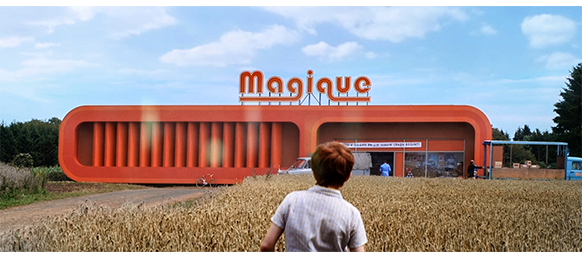 家に入って来た姉に、時代についていけないフレディの父は、悩みを打ち明ける。「仕入れ業者はスーパーにしか売らなくなった。顧客はスーパーで買い物をし、息子はスーパーのレースに出た」。「スーパーと話したら?」。「何を? 俺はアンドレ・デルミュール、父と祖父が苦労して作り上げた肉屋を破産させた男だってか?」。「祖先の話はやめなさいよ。もう死んで墓に入ってるのよ」(1枚目の写真)。「父さんの最後の言葉を忘れたのか?」。「『お前の将来は、パパや祖父ちゃんや曽祖父ちゃんと同じだ。肉屋を引き継げ』でしょ。そんなの、重荷だと思わない? 父親から息子へと受け継がれた重荷よ」。それでも、“デルミュールと息子たち” から肉屋を奪ったら何も残らないと言い張る弟に、姉は 「もし、私が息子として生まれてても、私なら跡なんか継がない。人生は1回限りで 命は短いのよ」と言って、出て行く。夜になり、寝室で、新調のドレスを着た妻は、嬉しそうに、「どう? マリエットからのプレゼントよ」と言う。「高級店でか?」。「ううん、カタログよ。彼女の家に届けられたの。カタログだと、どこにでも届けてくれるのよ。何でも宅配。便利よ」(2枚目の写真)。この言葉にヒントを得た父は、翌朝、フレディを呼び起こすと、自転車を持って下りてくるよう命じる。店では、父が、電話で 「子牛肉の切り身4枚と半ポンドのタルタルステーキですね。私どものヒーローが、15分でドアまでお届けします」 と話している〔大きな疑問は、父は、どうやって、このようなサービスを始めたことを、こんなに早く住民に伝えたのだろう、という点〕。フレディが服を着て下りて来ると、父は、これから都会でやっているような宅配を始めると言い、自転車に荷台を置き、その中に注文を受けた3つの包装を入れる。フレディが、「僕、1人で外に出ちゃいけないと思ってた」と言うと、勝手な父は、「もし、お前と俺とでスーパーマーケットをやっつけられたら、ママはお前を誇りに思うぞ」とおだてる。「ホントに?」。「そうしたいんだろ?」。「うん」(3枚目の写真)。