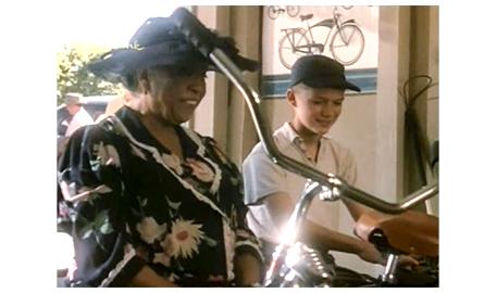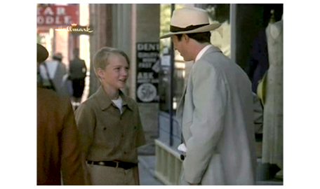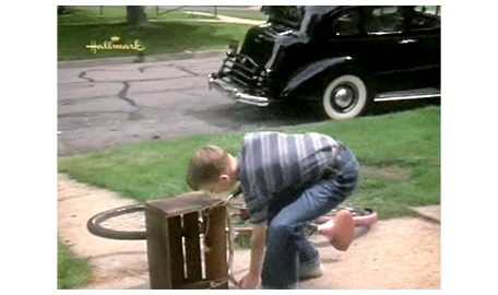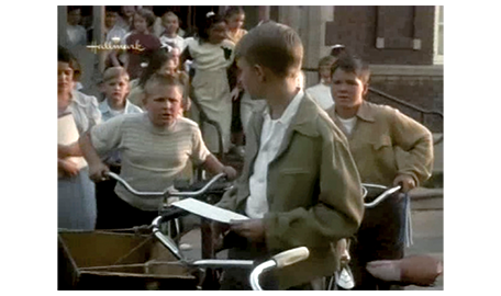 そこに、電話がかかってくる。電話を寄こした相手は 弁護士のパトリック。「30分ほどしたら伺ってお話がしたい」と話す(1枚目の写真)。「何を話したいかに よるわね」。「今後、どうするか、話し合わないと」。「自分のことは自分でできる。あんたが何を望もうが、母が何を望んでいたかも関係ない。私は老人ホームなんかには入らない」(2枚目の写真)。それでも、説得を続けようとするパトリックに対し、アーニャはさらに激しい言葉を投げつける。「承諾する気はないわ。人から、私に何ができて、何ができないか言われるのには、もううんざりなの! 私は盲目だけど、バカじゃない!!」。この言葉に、スコットはハッとする。パトリックが 最後に、「弁護としてではなく、友人として話してる」と言うと、「友人なんて要らない。自分のことは自分で出来るわ」と反論。スコットは、折角 友達になれると思ったアーニャが〔スコットは、みんなから知恵遅れと思われて敬遠され、一人も友達がいない〕、いなくなってしまうと思うと悲しくなり、アーニャの家を飛び出ると、自転車を起こし(3枚目の写真)、立ち去る。その後、アーニャと母が映画館から出て来るシーンがある。見た映画は『黄色いリボン』(1949.10公開)。すっと後で『女相続人』(1949.12公開)も登場するので、この映画の時代設定は、1949年末であろう。スコットは、母に歩きながら、アーニャのことを話した後で、祖父母について 「僕、いつか会える?」と訊く。母の返事は、「私たちを嫌ってた」。「思い直したかも」。「まさか」〔2人の立場の違いがよく分かる重要な台詞〕。
