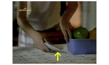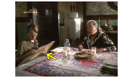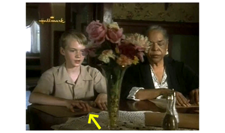 スコットは、出されたパイよりも、食卓の上に広げてあった本に興味を持って手に取る。「こんなものどうやって読むの? ただの小さな粒々じゃない」(1枚目の写真、矢印)。アーニャは、本を持って来させると、点字に触りながら、「いいかい、一つ一つの小さな粒が点で、文字は “マス” と呼ばれる単位からできてる。1つのマスには1個から6個の点があって、縦3点が2列に並んでるんだよ」と教える(2枚目の写真)。「サイコロみたいだね」。アーニャは、スコットの手を取ると、指で点字を触らせる(3枚目の写真)。「感じるかい?」。「うん」。「いくつ点が?」。「1つ」。「1つしかない時は、“A” なのよ」〔日本語の “ア”〕。「すげえ」。「また、使ったね」。しかし、アーニャが、「教えて欲しいかい?」と訊くと、スコットは急に尻込みし、急に、「行かないと」と言う。アーニャは、行って欲しくないので、「楽しいかもと思っただけだよ」と、それ以上強制はしない。スコットは、「僕、読むのが苦手なんだ」と弁解する。「皿を突く音がしなかったね。パイを食べるのも苦手なのかい?」。この言葉でスコットに笑顔が戻り、パイを食べ始める。