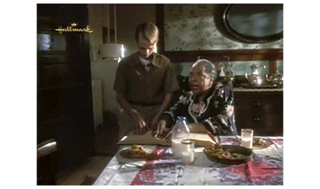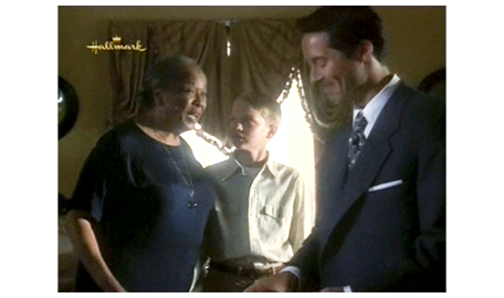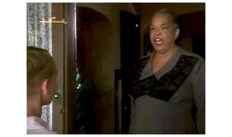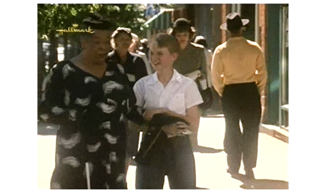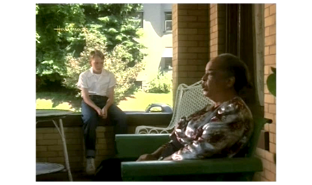 翌朝、スコットは、母に言われて髪を固め、Yシャツにネクタイ姿になると、テストを受ける前に アーニャに会いに行く。アーニャは、テストの日の朝にスコットが現われたので〔彼女には、ネクタイ姿は見えない〕、不審そうに、「テストを受けないの?」と訊く。「幸運を祈って欲しくて」。それを聞いたアーニャは笑顔になり(1枚目の写真)、「そうかい、幸運を。お前さんを誇りに思うよ」と言う。スコット:「言いたいことがあるんだけど」。アーニャ:「これまでだって、言ってきたろ」。「これまでずっと、ママと僕だけだった。でも、あなたは家族と同じだ。僕のお祖母ちゃんだ」(2枚目の写真)。その言葉を聞いて心打たれたアーニャは、スコットを抱きしめる。交差点を渡り終えた時に抱き締めた時とは違う意味の、スコットの心からの思慕に、アーニャは、「ありがとよ、坊や。感激だわ〔I'm so honored〕と喜ぶ(3枚目の写真)〔この映画の時代(1949年)、まだ、黒人は白人と同じ学校に通うことすら許されていなかった。最高裁が初めて違憲判断を示したのは、ようやく1952年になってから(Briggs対Elliot事件)。だから、この抱擁は信じ難いほど素晴らしい〕(https://www.loc.gov/)。アーニャは、さらに、「お前さんのお祖父ちゃんやお祖母ちゃんは、何を失ったかが分かってない。もし、お前さんを一目見れば、ばかげたことなんか すぐに終わるのに」と、とても重要なことを言う。スコットは、最後に、「忘れないで。明日は、パトリックの事務所に行く、大事な日だよ」と言って、別れる。
