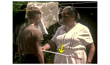 スコットは、かねてから欲しいと思っている “カッコいい自転車” を売っている店に行き、そこの主人に、戦争で盲目になった人が使っている杖はどこで買えばいいか教えてもらう。そして、自分の部屋に戻ると、その自転車を買うために ずっと貯めてきたガラス瓶の中身をベッドの上に空ける(1枚目の写真、矢印は瓶)。次のシーンでは、白い杖を持ったスコットがアーニャの家に行き、何度もドア・ベルを鳴らす。彼女は、裏庭で洗濯物を干している最中だったので、「裏庭よ!」と叫ぶ。そしてスコットが、「やあ、僕だよ」と言って入って来ると、「ドア・ベルを緊急事態みたいに鳴らしてどうしたんだい。2日も来なかったくせに」と不満を漏らす。スコットは、「いい物持ってきたんだ」と言う。「何だい?」。「盲目の人のための杖なんだ。これを覚えれば、一人で外出できるようになるよ」。しかし、アーニャは、「こんな杖なんか信用できるかい。返してきて」と、杖を突き返す(2枚目の写真、矢印は杖)。「でも、これを使えるようになれば、移らなくて済むんだよ」。「使い方なんか覚えないからね」。「簡単じゃないけど、あなたにとって大事なことなんだ」。「お前さんが大事だと思うだって? 私が何を大事に思ってるかは、まるで無視する気だね?」。「そんなこと…」。「私は、うんと年だし、すごく怖いんだ」。「僕が、いつも一緒にいるよ」。「何も聞いてないね」。「神が与えた生き方だから 受け入れろと言ったの、ちゃんと聞いてるよ」。「受け入れてないとでも?」。「家の中に隠れてるじゃないか」。「隠れてなんかない! 外に出てる!」。「外の世界のことだよ!」(3枚目の写真)。「目隠して、自分一人で通りを渡れるかやってみるがいい!」。「僕は、あなたに少しでも自由を与えたかったんだ」。アーニャは、その言葉に過剰反応し、「みんなのように生きたいと、私が望まなかったとでも?! 夢を見るのは止めたんだ! 私の居場所は、家の中で、外じゃない! 帰っておくれ!」と言い、それに対し、スコットも、「どこへでも行けよ! どうだっていい!」と、怒って出て行く。