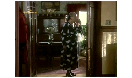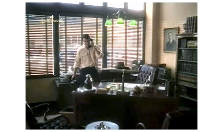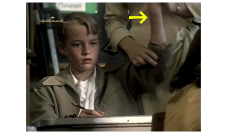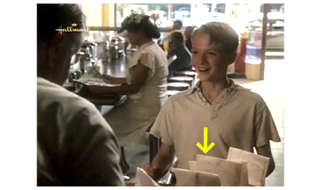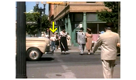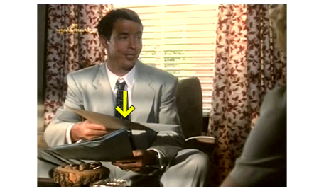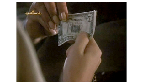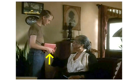 アーニャが戻って来る間、周りを見回していたスコットは、1つの棚にずらりと並んだベルを見てびっくりし、中でもきれいなカット・ガラスのベルを手に取って軽く振ると、ガラス同士がぶつかるきれいな音がする(1枚目の写真、矢印)。すぐに、アーニャの厳格な声が響く。「ちょっと。それに触る許可を与えた覚えはないわよ」。スコットが、ベルを元に戻し、アーニャの前に行くと、「いくら払えばいいんだい?」と訊かれる。「1ドル11セントです」。スコットは、まず小銭を受け取る。次に、アーニャは5ドル札を出して、「これかね?」と訊く(2枚目の写真)。相手が盲目なので、4ドル儲かったと思ったスコットは、「はい、奥さん」と答える(3枚目の写真)。「自分で勝手に出ておいき」。