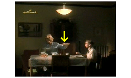 翌朝、スコットが起きて来ると、手紙は、まだ昨夜のままになっている。すると、キッチンから出てきた母が、「お早う、お寝坊さん。先に始めたわ、パンをひっくり返してきて」と言いながら、オレンジジュースをコップに注ぐ。スコット:「シナモン、忘れてるよ」。母:「切らしちゃった」。「シナモンなしの、土曜のモーニング・スペシャルなんて」。「シナモンがなくても、あなたがいればスペシャルなの」。そして。「疲れたの?」と訊く。「昨夜は、考え事があって眠れなかったから」(1枚目の写真)。「どんな?」。「気になって」。「何が?」。「通知」。「何の通知?」。スコットは、母がまだ気づいていない手紙を渡す(2枚目の写真、矢印)。手紙を見た母は、「ジェンキンズ先生が月曜の放課後、会いたいって。何なの?」。「知らない」。「学校じゃ、ちゃんと勉強してるわよね?」。「してるよ」。「仕事が、できなくなるのよ」〔呼び出しの時間帯は、まだ仕事中〕。「一生懸命やってるよ」(3枚目の写真)。