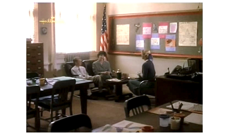 翌月曜日、学校があるのに、スコットは民間飛行場に行き、草むらから小型の飛行機をずっと見ている〔ずる休み〕。その日の午後3時半、母は、教師に呼ばれて放課後のクラスに行く。最初に見せられたのは、何枚もの欠席届(1枚目の写真、矢印)。教師は、「12枚全部の欠席届にあなたのサインがあります」と言う。「でもサインなんかしてません」。「そうだと思っていました。カンニングのことも話してないでしょ?」。「いいえ」。「私は、スコットの怠惰を断ち切ろうといろいろ試みました。劣等生のグループにも入れました。怠慢な生徒を恥ずかしがらせて頑張ろうとさせる懲罰法なんです。スコットは、最初からそのグループにいて、そこから出ようとする意欲のかけらも見せません」(2枚目の写真)。教師は、さらにスコットの学力の低さを指摘し、最後に、「何と言えばいいか… “slow(鈍感な、覚えが悪い)”…」という表現を使う。それを聞いた母は、「“retard(知恵遅れ)” だと?」と訊き返すと、イスから立ち上がり、教師を見下げるように、「私は息子を知っています。子供たちを辱めることが 良い教師だと思うなんて、残忍な人〔monster〕ね。教壇に立つ資格はないわ」とズバリ批判し(3枚目の写真)、そのまま決別する。
