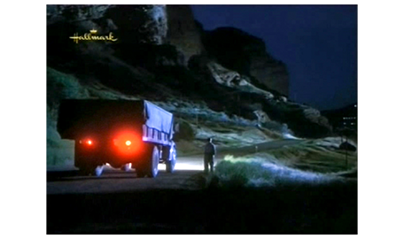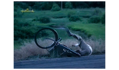 暗くなり始める頃、スコットは、いつもの古い自転車で鉄道沿いの登り坂を必死に漕いでいた。しかし、自転車のチェーンが外れるかしてスコットは、自転車ごと転倒(1枚目の写真)。遠方に行ける交通手段を失ったスコットは、その場にしゃがんで泣き出す(2枚目の写真)。そして、辺りが真っ暗になった頃、とぼとぼと歩くスコットの横で、1台のトラックが停まる(3枚目の写真)。夜、山の中の道を 子供が一人で歩いているので、運転手は、「こんなトコで何してる?」と訊く。「ガーフィールド(Garfield)〔ニュージャージー州にある町〕に行くとこ」。「ガーフィールド? ここから車で8時間だぞ」。そう言うと、ドアを開け、「乗れ。ちょうど通る」と言ってくれる。スコットの母が、電話機の前に座って連絡が来ないかと待っていると、ドアがノックされ、パトリックが入って来る。「電話ありました?」。「いいえ。警察は何て?」(4枚目の写真、矢印は母用の夕食)。「捜してます。朝までに戻らなければ調書をと。でも、心配は要りません。巡査部長の話じゃ、99%無事に帰るそうです」。「また戻って来て下さるとは」。「一人じゃない方がいいと思ったから」。そう言うと、持って来た紙袋の夕食を渡す。