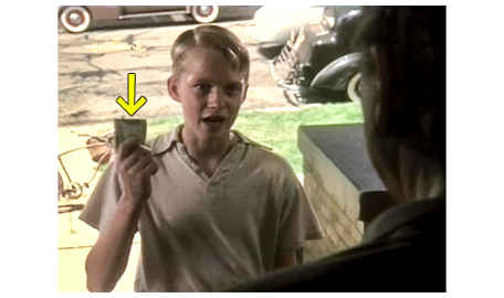スコットは、お札を見ながら大喜びで階段を降り、自転車に乗って10数メートル走ると、自転車を停める。次の場面では、スコットが、前とは違い、呼び鈴のボタンを押す。今度は、ドアが先に開き、アーニャが「はい?」と訊く。「タフのスコットです。払い過ぎだったと思います」。「何だって?」。「1ドルの代わりに5ドルが」(1枚目の写真、矢印)。「中にお入り」。スコットが中に入ると、「名前は?」と訊かれる。「スコット・ライムズです」。「年は?」。「13歳。8月に」。「ほんとは12歳だね」。「12歳半」。アーニャは、「ソフィア。イタリアのミラノから来た」と言う。「何です?」。「お前さんがさっき鳴らしたベルだよ。クリスタルで出来てるから、とても壊れやすい」。「僕が、何を鳴らしたか、どうして分かるの?」。「誰が話してても、ちゃんと分かるんだよ」。それを聞いたスコットは、「すげえ!」と汚い言葉を使い(2枚目の写真)、アーニャから叱られる。アーニャは、1ドル札と交換し、出て行くように手で指示する。そして、戸口に立つと、「ところで、お前さんに渡したのは5ドルだって知ってたんだよ」と言い(3枚目の写真)、ドアをバタンと閉める。