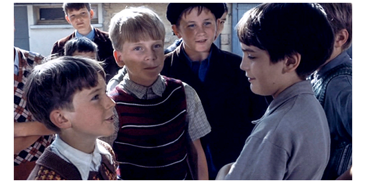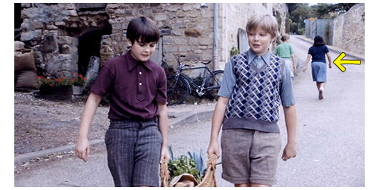 午後のミュミュの授業は、数学から始まる。「農夫は、長7m、幅5m、高2.5mの厩舎を持っている。1頭の牛に25㎥が必要なら、何頭飼えるか?」という問題を、10分で解かせておき、こんな簡単な問題をやっても仕方のないロジェとペルシャールを呼び、食料品の買い物に行かせる。買い物籠とお金とリストと配給カードを渡し、レシートを持って1時間で戻ってくるよう指示する(1枚目の写真)。2人で買い物籠を持って校内を歩きながら、ロジェは、さっきの喧嘩を踏まえて、「ゲノーは、君のお母さんの裸を見たの?」と質問する。「見てない。絶対」。「なぜ、あんなこと言ったのかな?」。「嫌がらせさ。この前、あいつを殴ったから」。「どうして?」。「あいつの親父のことでケンカしたんだ。民兵団〔ヴィシー政権下で活動した親ナチスの民兵組織〕にいたから」〔まだ戦後2年なので、裏切り者に対する蔑みは、2つ前に紹介した『その瞳に映るのは』の “HIPO豚” に対する敵意と同じだ〕。ここで、ペルシャールが、急に、「君、強いの?」と訊く。「うん。僕の押さえ込みは無敵だ。誰だって、やっつけられる」。「見せてよ」。「ここじゃダメだ。もし、ミュミュに見つかったら、少年院か予備軍学校に入れられる」(2枚目の写真)。「ここじゃ、退学になんかならないよ」。「休憩時間に」。ここから、映画では、ミュミュの授業のシーンに変わるが、ここでは、2人のシーンを先に紹介する。買い物の帰り、2人は仲良く話している。「将来、何になりたい?」。「自動車整備工〔Mécano〕」。「どうして?」。「いい車を持ちたいから」〔自動車整備工では、そんなお金は稼げないので、子供らしい発想〕。「君の父さんは、何に乗ってるの?」。「シムカ8」。「そりゃひどいな! 僕の義父は シトロ15だ〔シトロエン トラクシオン15 SIX D/オートルートの女王の異名を持つ名車〕。時速150キロは出せる。母さんが迎えに来る時乗って来るから、一緒に行こう」。ここで、話題が変わる。「自転車持ってる?」。「ううん。兄さんだけ」。「お気に入りなんだ。家から通って、自転車も持ってる。羨ましくない?」。ここで、2人は、少女2人とすれ違い、顔見知りのペルシャールは、「やあ」と声を掛け、少女は嬉しそうに笑う。「笑ってるよ」。「金髪は肉屋の娘、もう一人はタバコ屋の娘さ」(3枚目の写真、矢印は少女)。「素敵じゃないか〔Pas dégueulasses〕」。「おしゃまな子〔pisseuses〕さ。ミュミュは女の子が嫌い。僕たちが話してると嫌がるんだ」。