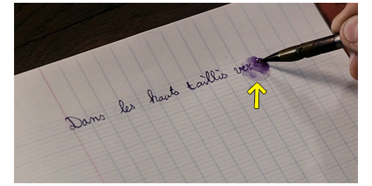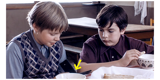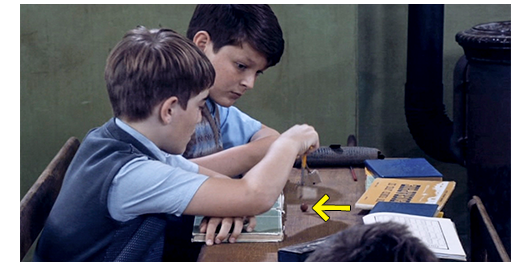 司祭による上級生のラテン語と英語の授業。最初にロジェが、ラテン語で、“バラ” の単数形を、主格、呼格、対格、属格、与格、奪格の順に発音する。「Rosa, rosa, rosam, rosae, rosae, rosā」。これは正解。次は、ラテン語が一番得意なジャン=フランソワ。“バラ” の複数形を 「Rosae, rosae, rosās, rosārum, rosīs, rosīs」と答える。3人目がペルシャールで、“主人” の単数形を 「Dŏmĭnus, dŏmĭne, dŏmĭnum, dŏmĭnus, dŏmĭnō, dŏmĭnō」と言い、ジャン=フランソワが、「属格は dŏmĭnīです」と間違いを指摘し、ペルシャールは修正して言い直す。これで、ラテン語は終わり、次は英語。ここで、お手伝いの女性が司祭にコーヒーとパリパリに焼いた薄切りのパンを持って来る(1枚目の写真、矢印はパン)。司祭は全員に「The book」と発音させ、「the」の発音が誰一人として正しくないのに腹を立て、パンを食べながら、「the」を繰り返し発音する。お陰で、司祭の正面に座っているペルシャールとロジェの本の上には、細かなパンくずが一面に降りかかる。そこで、少しでも飛んで来ないようにと、鉛筆に紙を刺して傘にして避けようとする(2枚目の写真)。それに目を留めた司祭は、もともと自分の下品な行為が原因なのに、2人に腹を立て、「この無作法者めが」と言うと、ペルシャールとロジェの順に頬を引っ叩き、そのまま出て行かせる(3枚目の写真、2人は痛くて頬を押さえている)〔司祭の2度目の暴力。これでも聖職者?〕。
