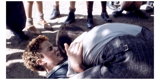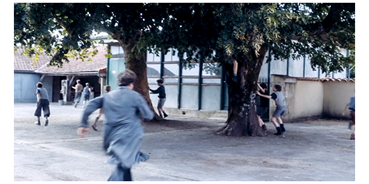 そして、休憩時間。さっそく、今まで一番強くて威張っていたランドローが、「誰だって、やっつけられるだと?」と言って、ロジェの前に現れる。「うん」。「ここで一番強いのは俺だ。見せてみろ」。ロジェが話したことをみんなに話したくせに、ペルシャールは、「戦わないで。殺される。彼は野獣だ」と止めるが、ロジェは戦い始める。最初は、振り回されて弱そうに見えたが、ある瞬間、ランドローの胸にしがみつくと、“押さえ込み” と言っていたフォール技でぐいぐいランドローを締め付け、遂には、背骨を折るような感じで地面に押さえつける(1枚目の写真)。ロジェが離れた後も、ランドローは胸を押さえて痛そうだ。ボスじゃなくなったランドローは、一人寂しく去って行く。年下の生徒がやってきて、「すごい押さえ込みだね。他にもできるの?」と訊く。「ああ、いっぱい」。「僕らの小屋、どこにあるか知ってる?」(2枚目の写真)。ロジェは、ペルシャールに訊くと、中庭の真ん中にある大木を示す。そこで、さっきの年下の生徒が先頭になって、木を登って行く。そして、ロジェを枝だけで出来た簡単なツリーハウスに連れて行くと、「ソーセージ〔リベロールの蔑称〕はドジだから、ここまで登って来れないんだ」と話し(3枚目の写真)、すぐ後から登って来たペルシャールは、「あいつ、重過ぎて登れないんだ」と、情報を正しくする。ツリーハウスには、「たくましい男たち〔Les dures〕」と書いてある。「これ何?」。「遊び仲間の名前。ランドロー〔リベロールの間違いでは?〕は壊したがってた。でも、滑り落ちて、首を痛めたんだ」。ここで、休憩時間が終わる。