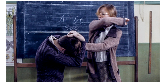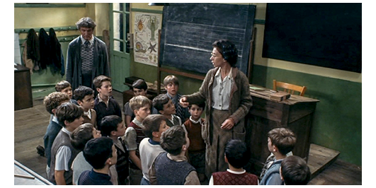 次に始まった授業では、ミュミュが、全員に『マ・ノルマンディー〔Ma Normandie、第3節〕』を歌わせている。ミュミュは、途中から教壇の真ん前の使われていないイスに片足を乗せ、スカートの中の一部が見える姿で歌を続ける。それを見たゲノーは、消しゴムをワザと床に落とし、拾いながら覗こうとする。歌が終わると、ミュミュは、そのままの格好で、「週末までに覚えなさい。では、教科書を取って、9年生(9e)は朗読の復習、8年生(8e)と7年生(7e)は歴史と地理の復習をしなさい」と言う〔現在使われている分類では、9eはCE2(8歳、小3)、8eはCM1(9歳、小4)、7eはCM2(10歳、小5)/ロジェは11歳なので6e(小6)に相当するし、ランドローはもっと年上(5e?)だろうが、それに対する言及がないのはなぜ?〕。ゲノーは、もう一度消しゴムを落としてトライするが(1枚目の写真)、ミュミュは、さっきと違って歌っていなかったので、すぐにそれと気付き、脚を閉じる。そして、「ゲノー、黒板へ」と呼ぶ。ゲノーが、消しゴムを探すフリを続けていると、強い調子で呼び付け、黒板の前に立たせる。そして、「1キロ60フランでリンゴを1キロ買う。500フラン紙幣で、お釣りは幾ら?」と訊く。数学が全くできないゲノーは、黒板に、1、60、500と書いただけ。ミュミュは、「ゲノー、あんたは、ロクに計算もできないくせに、性根の腐ったことには熱心なようね」と責め、もう一度、問題をくり返して言う。ゲノーが黙っていると、いきなり髪の毛を掴み、右手で叩き始める。何度も叩くと、今度は、ゲノーの隣に座っていたギヨトを呼びつける。そして、同じ問題を解かせる。彼が黒板に書いた数字は、500と60。そして、そして両者を足して 「560フラン?」と答える。こんな簡単な引き算すらできないことに、ミュミュの怒りは再度爆発し、2人の生徒を掴むと、何度も叩き、ゲノーには、教室から出て行くよう命じ、ギヨトは床に叩きつける(3枚目の写真、2つの矢印)。