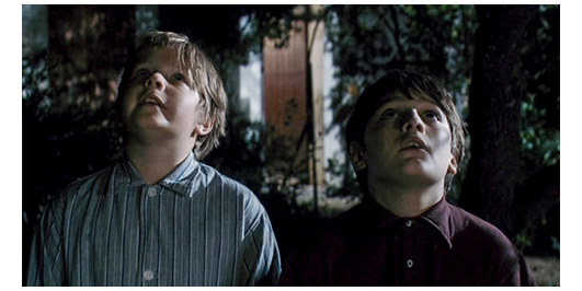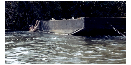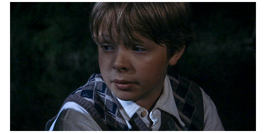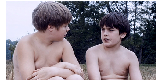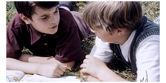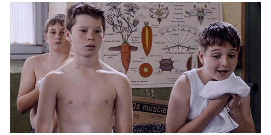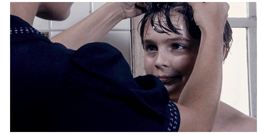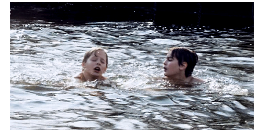 場面はすぐに切り替わり、生徒全員が川原の草地の上で、水着に着替えている。今や、離れられない親友同士になった2人は、仲良く一緒に服を脱いでいる。ロジェは、「君の母さんは、優しいね」と羨む。「そうじゃないのかい?」。「母さんは、ハグしてくれたこともない」。「父さんは?」。「意地悪な奴だ〔peau de vache〕。僕を殴ってばかり」。「どうして? さあ、いつもイライラしてる。僕の父さんじゃないみたいに」。「ひどいな」。リベロールが、全員、川に入るよう指示する。ペルシャールは、「君の平泳ぎ 見せてくれ」と言う。ロジェは、川に飛び込むと、上手な平泳ぎで対岸のボート目がけて泳いでいく。ボートの近くは流れが急なので、リベロールが、「戻って来い」と注意する。ロジェは岸に戻り、今度はペルシャールが飛び込むが、それは。我流のバタフライもどきで、泳いでいるのか、溺れているのか分からない。岸に戻ったペルシャールは、「やっぱり、クロールの方がいい」と言った後で、「ボートの下をくぐってみないか?」と提案する。ペルシャールは、今度は、まともなクロールでボートの上流側に到着。続いて、ロジェが平泳ぎでボートの船首に到着。その時には、ペルシャールは、もう潜り始めている。そこで、ロジェは泳いでボートの船首から下流側の船尾に向かう。しかし、待っていても、ペルシャールが現われない。心配になったロジェは、ボートの下に潜り、しばらくして、ペルシャールの首に手を掛けて浮上し、船べりに捉まる。「大丈夫か?」。「息ができなかった。死ぬかと思った」。「どうしたの?」。「パンツが引っ掛かって、動けなくなったんだ」。「戻って来ないんで、心配してた」。「君がいなかったら、僕は死んでた」(3枚目の写真)。「ううん、僕たちは、そんなことじゃ死なないよ」〔ロジェは、あくまで謙虚〕。