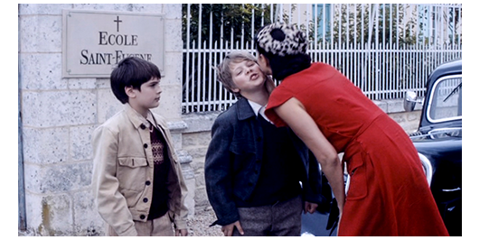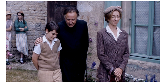 ロジェが学校の前まで来ると、大嫌いな父の車が停まっている。覚悟を決めて内庭に入って行くと、木陰には両親、司祭、ミュミュの4人が、待っていた。ミュミュは、「ずぶ濡れね。いったい何があったの?」と、“ある意味” 心配して訊くが、それを無視して、キチガイ親父が、「自慢たらたらか?」と、嫌味を言う。「どうなんだ?」。ロジェは泣き始める。「ミュラール先生に謝るんだ」。ミュミュは、何故か、「彼の責任じゃないわ。私にキスして」と言い、寄ってきたロジェの両方の頬に、キスする(1枚目の写真)。あまりの優しさに、ロジェは、ミュミュに抱き着き、「ごめんなさい。わざとやったんじゃありません」と、泣きながら謝る(2枚目の写真)。ミュミュは、「食べてから服を替えなさい。友だちが食堂にいるわ」と、ロジェを解放する。しかし、ロジェが席に着くと、すぐに司祭が入って来て、「ロジェ、来なさい」と呼ぶ。司祭は、食堂から出ると、「これを虐め〔brimade、人を虐める無益な処置〕と取ってもらいたくないんだが、君は、もうこの学校にはいられない。見せしめが必要だ。起きたことは深刻だ。君たちは、先生を尊敬しなくてはならんのだ。ミュラール先生は、君が留まることを望んでおられるが、私は望まん。だから、ご両親に迎えに来てもらった」(3枚目の写真)「食事が終わったら、荷物をまとめなさい」と告げる〔この司祭は、暴力的な上に、無慈悲にして狭量。このような小さな村の司祭で生涯を終えるに相応しい、レベルの低い人物だ〕。