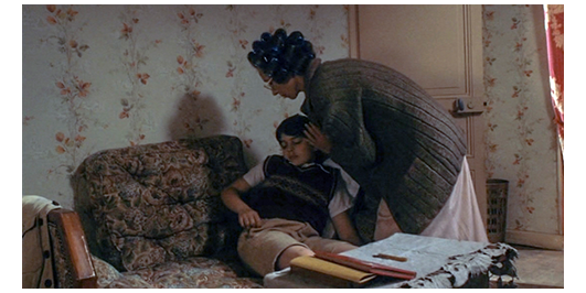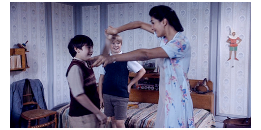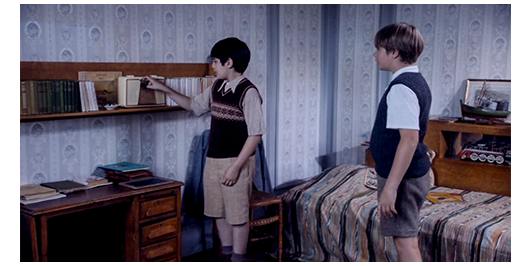 ロジェは、階段を上がりながら、ペルシャールに 「君の母さん、素敵だね」と言う。ペルシャールは、すぐにロジェを自分の部屋に連れて行く。「彼女は、お風呂に直行さ。そこに1日中いる。そのお風呂は、壁のすぐ向こうなんだ」。ロジェは、ラジオが置いてあったので、ボタンを押す(1枚目の写真)。流れてきたのはラテン音楽。すると、そこに下着姿の母親が入ってきて、「リリー・ファヨール大好き」〔1940年代の歌手〕と言うと踊り始め、ロジェを呼んで一緒に踊り始める(2枚目の写真)。母親が出て行くと、ペルシャールはラジオを消す。そして、その左に置いてあった5冊の本をどけると、その後ろのレコードのジャケットを横にズラし、出てきた穴から覗く。ペルシャールは見慣れているので、すぐにロジェと代わる。ロジェが覗くと、そこにはペルシャールの母が全裸でバスタブに入っているのが見える(3枚目の写真)。ペルシャールは、「きれいだった?」と訊く。「すごく」。「君の母さんの裸、見たことある?」。「ううん」〔そもそも、浴室がない〕。「醜いの?」。「ううん、だけど 吐きそう」。