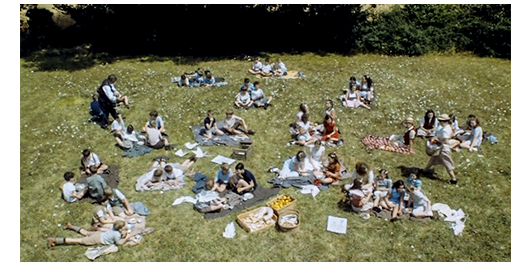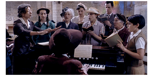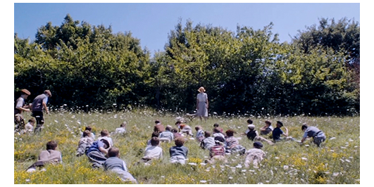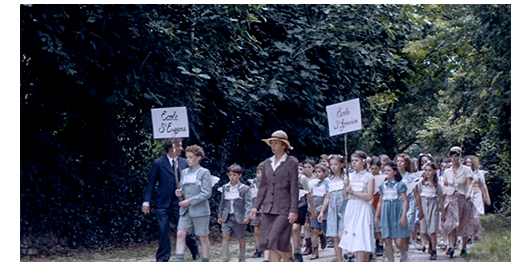 その後、2つのエピソードがあるが、好きになれないので省く。川の上を46人の男女の生徒と、司祭、ミュミュと女子校の教師達を乗せた大きな木造船が進み、その上で、生徒達が背中に小さな天使の羽根を付けて合唱している(1枚目の写真)。生徒達は船から降りると、男女に分かれて整列して歩き(2枚目の写真)、野原に建っている初期ロマネスク様式の教会〔ロケ地のAubignéの約40キロ南にある12世紀に建てられたAbbaye de Châtres〕の前に参列する。生徒達の中には、ペルシャールとロジェがミュミュに買い物に行かされた時に出会った2人の少女がいて、「今日は」と親しげに挨拶する〔この映画の欠点は、時間の経過が曖昧な点。生徒達の服装は、万聖節の時より軽装なので、いつの間にかクリスマスを過ぎたことになる。最初に会った時が夏で、それから半年、一度も会わないで、こんなに親しくなれるのか? それとも時々買い物に行かされて、会っていたのか?〕。その、宗教行事が終わると、生徒達は草花が咲き乱れた野原の上に2~4人ずつまとまって座る(3枚目の写真)〔以前、ミュミュの野外授業が会った時と花の様子が同じ。映画では、この先、復活祭(1948年3月28日)がある。なのに、全員が半袖。映画の撮影が2009年の夏なので、冬のシーンなど無理なので、どうしても不自然なワンパターンになってしまう〕。