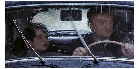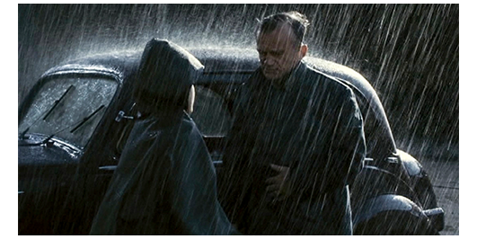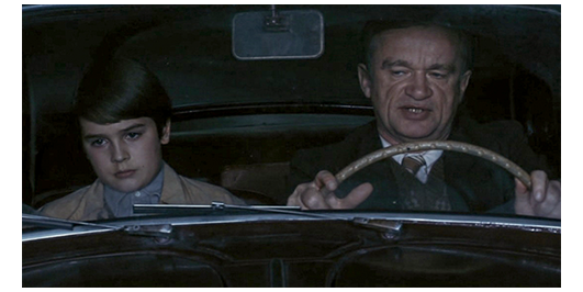 早朝、雨の中、雨合羽を着たロジェが、教会が運営するコレージュ(中学)を出て来る(1枚目の写真)。ここで、本人の声で解説が入る。「僕は11歳。名前はブラス・クレ。平泳ぎが上手いことから付いたニックネームだ。今は1947年。コレージュから退校になったところだ。父さんは、1939年に刑務所に入り、45年に釈放された。僕を車で迎えにきている」(2枚目の写真)「両親にとって、僕はどうしようもないクソガキだ。でも、今回だけはムカついた。退校処分は絶対間違ってる。ボーディエの奴が生徒指導員に、あることないと言いつけたんだ」〔父の車はシムカ8。1938-51年にかけてフィアットのフランスの子会社シムカが販売した中級車〕。父は、運転しながら、「さぞや、鼻が高いだろうな?」と皮肉を言う。「誓うよ、間違いなんだ! あんなこと絶対言ってない! 全部ボーディエがでっち上げたんだ。いとこ とはバカなことやったけど、他には何もしてない」(3枚目の写真)。「ムショにいた時 来てくれた神父さんが、信じ難いほどひどいと言ってたぞ」。