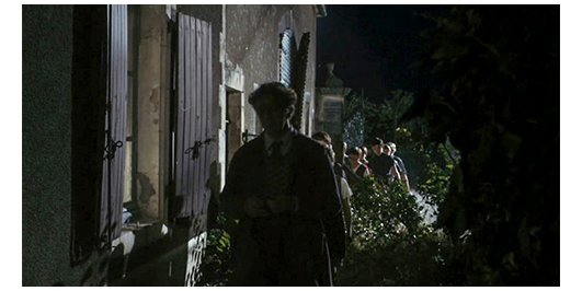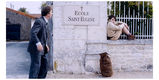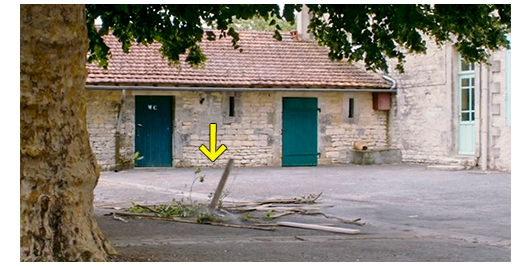 学校が休みになり、ロジェとペルシャールを含め、生徒達が門の所で迎えを待っている(1枚目の写真)。2枚目のグーグル・ストリートビューは、ロケ地となった小さな村Aubignéの町役場の一番端。この村は、偶然、ロジェの家のあるニオールの南東約40キロにあり、ミュミュの学校があってもおかしくはない。ところで、映画の最初の頃には、汗まみれのシーンや、その後、水泳のシーンがあったので、夏は過ぎている〔撮影は2009年の7月〕。映画の中で言及はないが、この場面は、①単なる週末か、②特別な日なら万聖節(1947年11月1日)であろう。ペルシャールの母親がやって来て、彼は助手席に乗り込むと、2人揃ってロジェに手を振って別れる(3枚目の写真)。ロジェは、その後も待ち続け、遂に一人になってしまう。ずっと立っていてくたびれたので塀の上に座っていると、リベロールが中から走って来て、「ランティエ、君の両親から電話があって、今夜は来られないそうだ。障害ができたとか。先生が説明してくれる。来るんだ」と言う(4枚目の写真)。