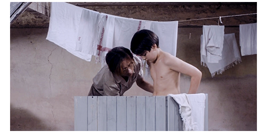 家の前に着いたロジェは、窓越しに手を振ってくれる母に向かって手を振る(1枚目の写真、矢印)。部屋に入ったロジェの上半身を脱がした母が、「なんでそんなに汚いの?」と驚く。「残りは自分で脱いで、洗い始めなさい」。ロジェは、水の入ったタライを前に、靴下、ズボン、パンツの順に脱いで、横に捨てる。そして、タライに入って足から洗い始める(2枚目の写真)〔この家には、風呂もシャワーもない〕。そこに、湯の入ったポットを持った母はやって来て。「頭を洗うから、石鹸を貸して」と言い、頭から湯を掛ける。「だけど、なんてべたべたした髪なの? これ、エンドウ豆?」(3枚目の写真)。「友だちが、頭にスープを掛けたんだ」。