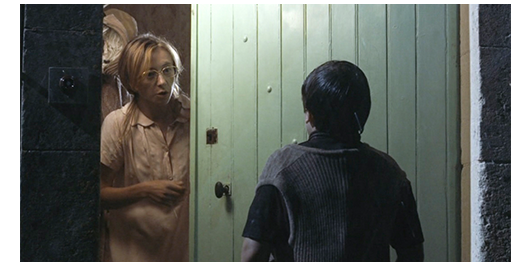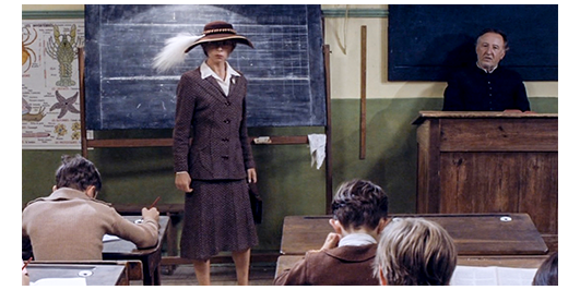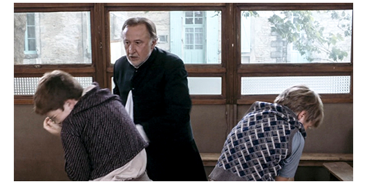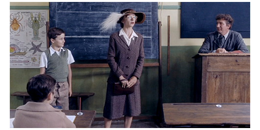 夫がいなくなった後、ある意味、“見て見ぬ振り” しかできない愚かな母は、ロジェを助け起こす。そして、ロジェを抱きしめる(1枚目の写真)〔しかし、この行為の中に称賛すべき点は何もない。母は、ずっと前からロジェを見捨てて、何も行動を起こさなかったのだから〕。翌日、サン・トゥジェーヌの教区司祭から許可が下りたので、キチガイ親父は夜道を運転して司祭のいる学校に向かう。「おとなしくしてろ。今度バカやらかしたら、少年院だぞ」(2枚目の写真)。「他に行く所がなかったので、僕はサン・トゥジェーヌにある、県内で最もきらわれ者〔vache〕の教師ミュミュが教える村の学校に行かされることになった」。着いた頃は外は真っ暗。しかし、ミュミュの授業は続いている。科目は国語。「背の高い緑の茂みの中で、無数のさえずる鳥が…」という文を、一語一語呼んで、聞き書きをさせている。ドアがノックされ、ミュミュは、お気に入りの生徒に開けに行かせる。入って来たのは、キチガイ親父とロジェ。ミュミュは、「ああ、ランティエさん」と言い、ロジェには、「今晩はロジェ、2年分大きくなったわね」と声をかける(3枚目の写真)。しかし、ロジェが 「今日は、先生〔マドモアゼルと言うので、未婚〕」と言うと、「夜だから、今晩はと言わないと」と注意し、ドアの横に荷物を置かせ、座る場所を指差す〔空席も目立つ〕。キチガイ親父は 司祭に会いに行く。