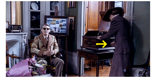 生徒達は内庭全体に拡がり、ロジェとペルシャールを含め3名がツリーハウスの木に、他の2人がもう1本の木に登る(1枚目の写真、手前はリベロール)。リベロールは2つ目の木の下から、「降りて来るんだ」と呼びかけると、2人は 「捕まえに来いよ」。「害獣だ」と笑う。リベロールが、「先生に言いつけやる」と言うと、隣の木で聞いていたペルシャールが、「告げ口屋。でかゴミ」と罵り、もう1人が、「来いよ、ソーセージ」と煽る。怒ったリベロールは、木に登り始めるが、滑って地面に仰向けに落ちる。リベロールがもう一度トライして、ツリーハウスまで登って来ると、その前に、3人は枝で作った “橋” を渡って隣の木に。リベロールは、怖くて枝を歩けないので、3人はそれを見て笑う(2枚目の写真)。リベロールは、「この悪ガキめ、覚えているがいい」と言うと、諦めて木から降りる。すぐにツリーハウスに戻った3人は、リベロールに向かって折った小枝を投げつける。リベロールが司祭の住居の方に走って行くのを見たランドローは、全員に警告を発する。ここで、画面は切り替わり、おめかしして大佐の家を訪れたミュミュが映る。大佐は、戦時中の色々な記念品に囲まれ、色の濃い眼鏡をかけ〔戦争で失明?〕、上品な部屋に1人で座っている。「心配していました。あなたは、いつも時間厳守だから」。「バスが遅れました」。大佐は、目の前に円テーブルに置いた大きな花束と、チョコレートの箱を杖で指して、「あなたにです」と言う〔メイドがいて、全部揃えてくれる〕。「ここずっと、私のために読んで下さったから」。ミュミュが持って来たレコードをかけると(3枚目の写真、矢印は、手で回しているところ)、大佐の目から涙が溢れ出る。大佐が、手探りしながら、隣のイスに腰かけたミュミュの手を握り締める姿は、恋なのか?