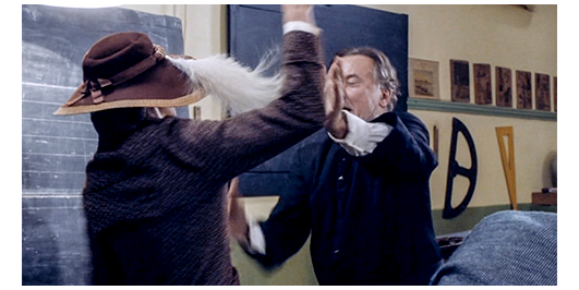 ミュミュが、午後7時半過ぎに戻って来ると、教壇にはリベロールではなく、司教が座っている。「どうされました?」。「罰として居残りを。彼らは、リベロールさんを暴漢のように襲い、石を投げつけた〔石ではなく小枝〕。私の所に助けを求めに来るほどひどく」。「いつ起きました?」。「あなたが出掛けてすぐ」(1枚目の写真)。ミュミュは、優等生のジャン=フランソワに、「何が起きたの?」と訊く。「知りません、先生」。「どういうこと? そこにいなかったの?」。「いましたけど…」。それ以上は、涙で何も言えない。ミュミュは、生徒達を順に見て行き、直感で、犯人はランドローだと確信する。そして、前に呼び出すと、懲罰用の木の棒を持ち、両方の手のひらを見せるように命じる。手のひらは真っ黒だった。それが証拠とばかりに、ミュミュはランドローの手のひらを棒で何度も叩く。そして、「騒動を始めたあんたに違いない〔実に鋭い〕。この穢れた犬め!」と叫ぶと、今度は、棒で、頭や体をめった打ちにする(2枚目の写真)。「穢れた牛! 穢れた害獣!」。度が過ぎると思った司祭が止めに入ると、ミュミュは、さすがに棒ではなく、両手を使って司祭と争う(3枚目の写真)。それを見た生徒達から笑い声が起きる。司祭は、ミュミュが鎮まらないので、生徒達を教室から追い出す。それでも、ロジェやペルシャール達は、ドアの外から様子を伺っている。ペルシャールは、「ミュミュは、時々、完全に異常になるんだ」と、ロジェに言う。