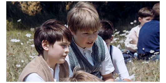ミュミュの野外授業。場所は、草花が咲き乱れた野原(1枚目の写真)。「10年生(10e)、9年生(9e)は、15分間、授業の復習。8年生(8e)と7年生(7e)は、これから実物教育を行います」と言う〔以前と同じ疑問。6eや5eは何をすれば?〕。ロジェは、先の夜の会話で、ペルシャールの夢が 「世界中を旅して回ること」だったのを話題にし、「もし、邪魔されたら? 逃げ出すの?」と訊く(2枚目の写真)。「船に乗って冒険に出るんだ」。「他の国へ?」。「そうさ」。「やるの?」。それに気付いたミュミュは、「ランティエ、ペルシャール、またおしゃべり? 離れなさい」と命じ、ペルシャールが別の場所に移る。ミュミュは、8eと7eを対象に、「実物教育の116ページを開いて、花について学びましょう」と言い、ヒナギクを1本取って、がく、花弁、雄しべ、雌しべについて説明する。ブタンが、草笛で遊んでいるのを見つけたミュミュは 「先生は、何と言いましたか?」と質問する。ミュミュは 「雌しべの中に胚珠があります」と教えたのに、ブタンは 「胚珠の中に雌しべが」と答え、「反対でしょ、この間抜け! 何てバカなの! 『僕はバカの王様で、何も知りません』と100回書きなさい」と叱られる。今度は、ギヨトが鼻や耳に花をつけて遊んでいる(3枚目の写真)。ミュミュは、「天才のギロト君、それは『calice』なの?」と訊く〔caliceには、①がく、②聖杯の意味がある〕。“がく” のことなど聞いていなかったギロトは、「司祭様がミサの時に使われる、司祭さん花器ですね?」と答え、「あの聖杯じゃないわ、この間抜け。司祭の聖杯と、花のがくを混同するなんて! ギロトのバカ! あんたのお母さんはキラキラ星を生まなかったのね」と叱られる〔ミュミュの口撃は、今なら許されない 個人に対する侮辱に満ちている〕。