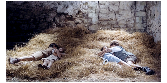 ロジェは、2人の少女を見て、「話しかける?」と提案し、ペルシャールも「賛成」と言う(1枚目の写真)。女の子の方も、金髪の子が、2人を見ながら、「可愛いわね〔mignons〕」と言い、もう1人も、「ええ」と ほほ笑む。野原の上での昼食が終わると、ミュミュは、「1時間、はしゃいでもいいわ。ボール蹴りをしたい子は、リベロールさんとなさい。私は、小さな子たちとゲームをします。ここから離れないように。15時には、全員が、マシュプール司教がおっしゃった晩祷〔夕べの祈り〕に参加します。そのあと、会堂の中をガイド付きで見て、引き返します。楽しみなさい」と、アナウンスする〔女子校からも教師が来ているが、映画の中では発言しないので、女生徒が何をすればいいのか分からない〕。ロジェとペルシャールは、2人の女生徒のところに行き、ロジェが、「島に行かない?」と誘う。金髪の子:「ええ、いいわね、あなたは?」。もう1人:「悪くないわね。もし30分で着くなら」(2枚目の写真)。ロジェ:「僕たち、先に行くよ。一緒のとこ見られちゃマズいから」。「いいわ」。どちらかと言えば、消極的な2人目の子が、「ついてくの?」と訊くと、金髪の子は、「怖いの?」と訊き返す。「そうじゃないけど…」。「食べられちゃう訳じゃなし。行くわよ」。4人が行った先は、島の中にある納屋。その藁の上で、ロジェは金髪の子と、ペルシャールはもう一人の子とキスを始める(3枚目の写真)。もともと積極的だった金髪の子は、ロジェとキスを続けるが、もう1人の子は、嫌がってペルシャールにキスさせない。