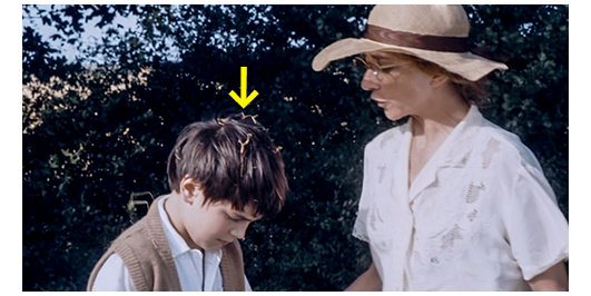 55分が経過し、ミュミュが、「あと5分よ。服を着なさい」と声を掛ける。ボールを蹴って遊んでいる生徒の中に2人の姿がないので、ミュミュは、「ランティエとペルシャールはどこ?」と、リベロールに訊く。「知りません」。ミュミュは、生徒達にも、見なかったかと訊くと、「いいえ、先生」との返事。ミュミュは、「ちゃんと見張ってなきゃダメじゃないの、バカね! 探してらっしゃい、この間抜け!」とリベロールを叱る〔相変わらず、口ぎたない〕。そこに、女子校側の代表が来て、「2人の生徒がいません。見ませんでしたか?」と尋ねる。2と2なので、ミュミュはすぐにピンと来る。そして、リベロールに、「分かった? 探すのは4人よ!」と言った後で、「思い知らせてやる、不品行な悪ガキども」と、ブツブツ言い、まだ動こうとしないリベロールに向かって、「走って!! すっ飛んで!!」と怒鳴る。その頃、納屋から出てきた消極的な女の子が、時計を見て、「1時間過ぎちゃった」と言う。金髪:「何て言われるかしら」。「そう言ったでしょ!」。「一緒に来なきゃよかったのよ」。「あなた、口見た?」。「口がどうかした?」〔キスのし過ぎで、唇の周りが赤い〕。2人は途中でリベロールとすれ違う。2人を見たリベロールは、その先の納屋に向かって、「ランティエ、ペルシャール、出て来い!」と叫び、女生徒2人には、「そこで待ってろ」と命じ、納屋に走って行く。次のシーンでは、リベロールに連れられた4人が、茂みの中から出て来る。ミュミュ:「みんな、どこにいた?」。リベロール:「納屋です」。「何てふしだらな!」。女生徒を引き取らせると、ミュミュは、つかつかと2人に歩み寄り、頬を引っ叩く(1枚目の写真)。そして、ロジェを脇に連れて行くと、「あんたが、信頼できないガキだって分かった。ほんとにがっかりしたわ」(2枚目の写真、矢印は藁)「優秀な生徒にしてあげようとした時間は、全部無駄になった。あんたには、構ってあげる価値などない」と、冷たく言い放つ〔ロジェにとって、最大のショック〕。学校に戻った翌朝、ロジェは司祭の部屋に呼ばれる。そして、「昨日、Notre-Dame de la Touche〔ロケ地のAubignéの約325キロ東。遠すぎるような…〕で何があった?」と質問される。ロジェは、「僕たち、女の子2人と散歩に行きました」と、嘘を付く(3枚目の写真)。「それは、禁じられた行為だ」〔ロジェの髪の毛に藁が付いていたことまでは、報告されていない〕「みんなに心配をかけた。特に、ミュラール先生に。君を罰するよう頼まれた。私に、その積りはない。ただ、二度としないと約束しなさい。分かったな?」。「はい、司祭様」。「もう1つ。君の両親から電話があった。復活祭の休暇中、ここにいて欲しいそうだ」〔前述したように、急に、3月28日が目前に迫る。外は、夏なのに〕。「なぜです?」。「君のお父さんは、仕事の関係者に夫婦で会いに行く必要があると 言っていた」。「僕の兄さんは?」。「何も聞いてない。私たちは、一度君の両親と話し合わねばならんと思っている」。ここで、ロジェが泣き始める(4枚目の写真)。司祭は、「泣くんじゃない」と言って、ハンカチを渡す。そして、復活祭の間ここにいたら、いろいろなことができると言った上で、ミュラール先生は君に期待していると 励ますが、それは昨日の激しい小言で夢が破れたので、慰めにはならない。