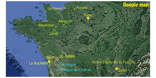 その日か、別の日の夜、星空を見上げて、ロジェは、「星、幾つ数えた?」とペルシャールに訊く(1枚目の写真)。「66。5日以上」。「僕は終わった。今夜、願い事をするんだ」〔「2ヶ月の間、毎晩 星を12個数える」と言っていたが、あれから7ヶ月以上経っている〕「君、今でも舵を取りたい〔barrer〕?」。「なぜ?」。「両親は、復活祭の間、僕をここに閉じ込める気だ」。「ひどいな」。「僕たち、舵を取らないと。見てよ、地図でルートを考えたんだ。ラヴァルに着いたら、マイエンヌ、アランソン、ルーアンからル・アーヴルへ。そこで船に乗るんだ」(2枚目の写真)。ここで、これまで出て来た地名の位置をフランスの地図の上に落としたものを3枚目に示す。黄色の×は、映画の中で実際にある場所として出てきた場所。空色の×は、ロケ地。黄色の●は代表的な都市。ミュミュの学校は、架空の場所にあるが、ロジェの家や、ミュミュの好きな大佐の家のあるNiortと、ペルシャールの家のあるSt. Gelaisの近くにあると思われる。そういう意味では、学校のロケ地のAubignéは、実に “それらしい” 場所にある。また、学校の行事で生徒達が船で行き、ロジェが大失策をする聖堂のあるロケ地Abbaye de Châtresも、割と近くにある。一方、この行事の開催地として司祭が口にする聖堂Notre-Dame de la Toucheは、リヨンの近くにあり、信じがたい。この節で、ロジェが口にするLaval→Mayenne→Alençon→Rouen→Le Havreは、学校のある場所からかなり離れていて、目的地のLe Havreの近くに集中している。ただ、学校があるらしい場所からLavalまでは真北に進むだけなので、ロジェは口にしなかったのかもれない。このロジェのルートに対し、ペルシャールは、「どうやって、そこまで行くの?」と訊く。「歩いて」。「何日かかる?」。「5、6日」。「1日何キロ歩くつもり?」。「50」。「あのね、考えたんだけど、できないよ。母さんが死んじゃう」(4枚目の写真)。「君が辞退するのは知ってた。構わないよ。僕一人で行くから。どっちみち、僕はいつも一人ぼっちだから」。ロジェは「構わないよ」と言ったが、ロジェのペルシャールに対する友情には、聖堂での大失策と合わせ、大きな亀裂が入る。