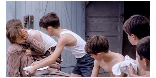 同じ日か、違う日か分からないが、生徒達全員が校舎の壁際で上半身裸になっている。その時、トイレから出てきた1人の生徒が、中庭の木の上からツリーハウスの木材が投げ落とされているのに気付く、そして、生徒達の方に走って行くと、「ソーセージが、菩提樹の小屋を壊してる」と緊急報告(1枚目の写真、矢印は木材)。生徒達は、ミュミュが目の前にいるため、何もできず、恨み節を口にするだけ。ミュミュは、板で囲いをした場所に立ち、1人ずつ生徒を呼んでは、布手袋で生徒の体をこすって垢を落としている〔この学校には、シャワーすらない〕。次の番はロジェ。「四角形とは何?」。「4 つの辺と 4 つの頂点を持つ幾何学図形です」。「よろしい、パンツを下げて」。ミュミュは一番不潔な部分を洗う〔ミュミュは、朝早くから就寝まで教え、こんなことまでさせられている。大変な重労働だ〕。「平行四辺形は?」(2枚目の写真)。「辺が等しく平行な四角形です」。「よろしい。今夜、私の部屋で復習よ」。次のシーンでは、生徒達が教室で席に着き、教壇には、ソーセージことリベロールが座っている。そこに、一張羅を来てカバンを持ったミュミュが入って来て、お気に入りの生徒にカバンを持たせる〔バスまで運ばせる〕。初めて見る光景に、ロジェは、「ミュミュ、どこ行くの?」とペルシャールに訊く。「隔週木曜日に、ニオールの大佐の家へ」。「大佐?」。「空軍の。絶対、ミュミュの彼氏だ」。ミュミュは、生徒達に 「リベロールさんと一緒にいること。19時半のバスで戻るわ」と言い、荷物持ちと一緒に教室を出て行く。最後部の机のランドローは、窓から、ミュミュ達が門を出て行ったのを確認すると、すぐに立ち上がり、叫びながら 机の上の物をリベロールに向かって投げ付け、他の生徒もそれに倣ってリベロールを攻撃する(4枚目の写真)。ツリーハウスを壊されたことに対する復讐だ。生徒達は、リベロールを放っておいて、中庭に飛び出して行く。