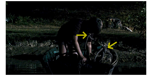 ロジェは、3月のフランス中部〔ラ・ロシェルの気温は最高12℃、最低7℃〕に咲いているはずのないお花畑の中を必死に走る(1枚目の写真)。その頃、リベロールから話を聞いた司祭がやってきて、何が起きたのか生徒から詳しく訊き出す。当たりが真っ暗になった頃、池のほとりに辿り着いたロジェは、岸に縛ってあったボートに乗ると、ロープを取り出す。そして、一旦岸に上がると、手に持てる限界の石を持つと、ボートまで運ぶ。そして、ロープを石に十文字に縛り付け、もう一方の端を輪状にし、自分の首に入れて絞る(2枚目の写真、矢印はロープの両端)。ボートから川に入って〔足が付かないほど深い〕、ボートのへりに捉まりながら、石を水中に落とす。石と一緒にロジェも沈んで行くが、十文字縛りでは、重い石を支えきれず、石だけ落下し、自殺は失敗する。ロジェは、ボートまで浮き上がると何とかボートに這い上がる。シーンは、翌朝となり、2年の憲兵が池に沿った小道を捜索していると、岸近くに建っている小さな小屋の中に、ロジェが寝ているのを見つける。ロジェはずぶ濡れのままなので、親切な憲兵は制服を脱いで着せてくれ、一緒に学校まで歩いて行く(3枚目の写真)。