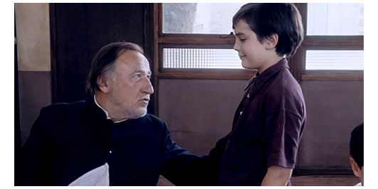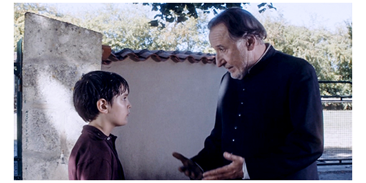 そして、朝食の時間。食事の前に立ったまま、全員で唱和するのが、『マタイによる福音書』の第6章13節。「わたしたちを試みに会わせないで、悪しき者からお救いください」(1枚目の写真)。全員が座ると、ミュミュは、ロジェに司祭様に挨拶に行くよう命じる。司祭は、ロジェのニックネームを覚えていて、「お早う、ブラス・クレ」と言ってくれる。それを聞いて、ロジェの顔がほころび、「お早う、司祭様」と返事する(2枚目の写真)。「大きくなったな。よく戻った。だか、今年は大変だぞ。ラテン語と英語がある」。それだけ笑顔で言うと、食事の席に戻るように言い、食事開始のベルを鳴らす。ロジェの向かいの子が、「司祭さん、何て言ったの?」と訊く。「ブラス・クレ」。「なんで?」。「僕の泳ぎ方さ」。「ホントの名前は?」。「ランティエ。君の名は?」。「ジョリ。何度、退学になったんだい?」。「4回」(3枚目の写真)。それを聞いたジョリは、テーブルの端にいる子に向かって、「おい、ブタン、彼、君を負かしたぞ。4回退学になったってさ」と教える。