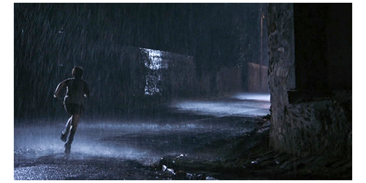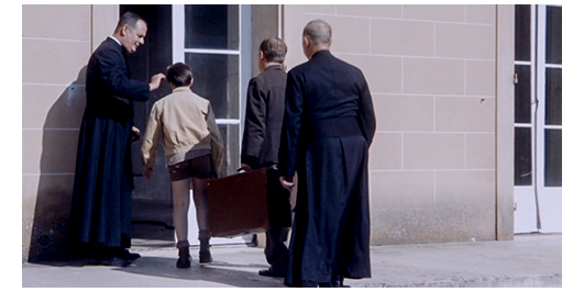 ロジェは、サン・ジョゼフに連れて行かれ、修道僧に迎え入れられる(1枚目の写真)。翌朝、生徒達が内庭で遊んでいても、ロジェだけは、門の鉄柵に手をかけて外の世界を見ている。そこに、自転車に乗った兄がやって来て、「母さんがお前の鞄に入れ忘れたから、持って行ってくれと頼まれた」と言って、下着の入った紙包みを渡される。サン・ジョゼフの並木道の向こうには、兄の友達が待っているので、ここはロジェの家の近くにあるコレージュ。同じ町にいるのに、片や通学で、片や寮生活。本当に嫌なキチガイ親父だ。その夜、ロジェは、大部屋のベッドから身一つで抜け出すと、こっそりと玄関を出て行く(2枚目の写真)。遠くから雷鳴が聞こえる。ロジェが、サン・ジョゼフの裏口から外に出て、街路を走り始めると、滝のような雨となる(3枚目の写真)。それでも、ロジェは走り続ける。